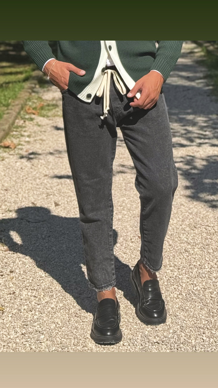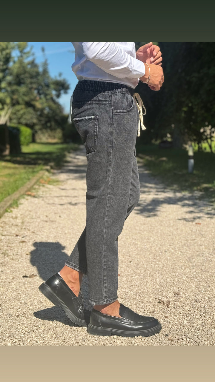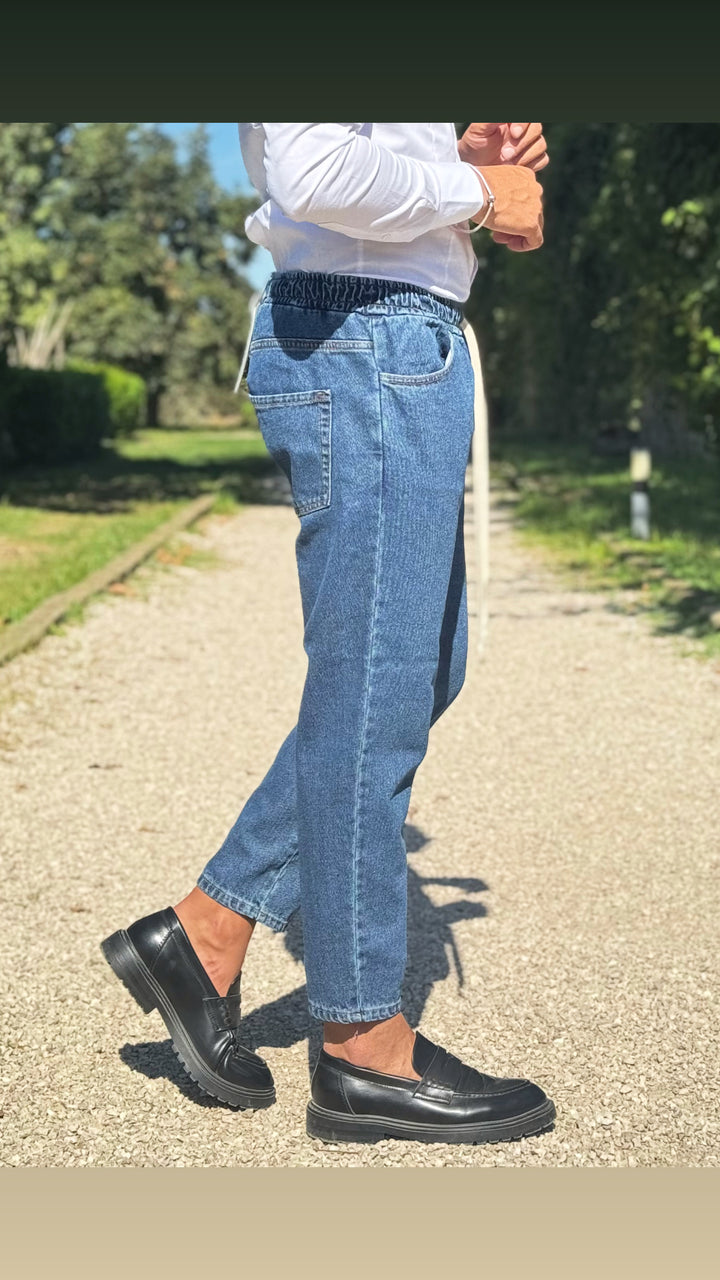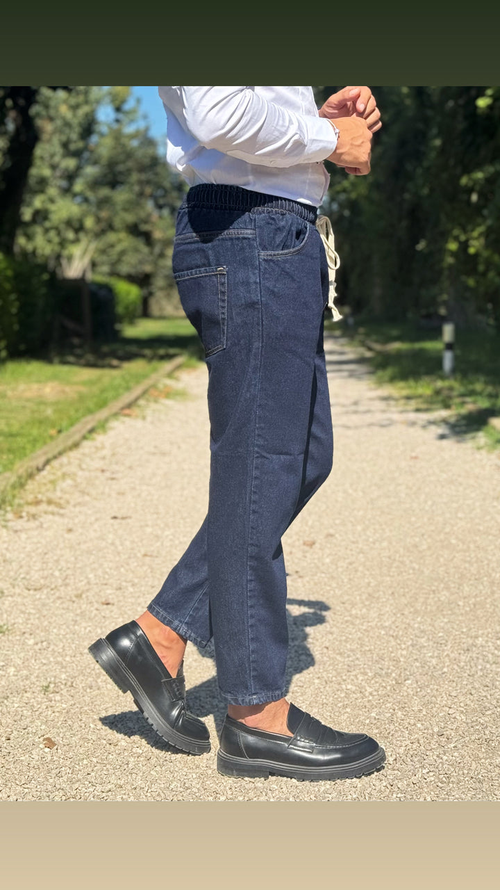 Pantalaccio in tessuto jeans con elastico e laccetti in vita. Vestibilità regolare, il modello 1,76 per 73kg indossa M