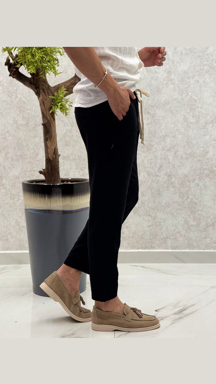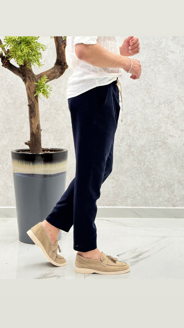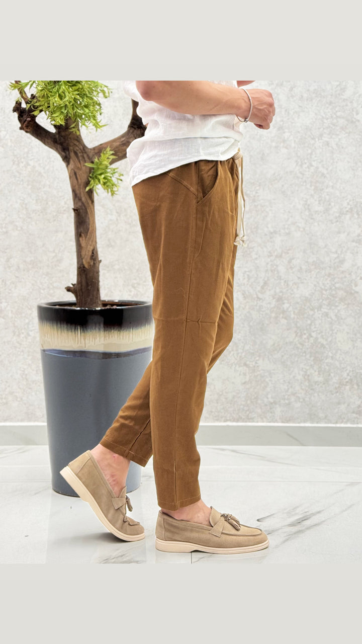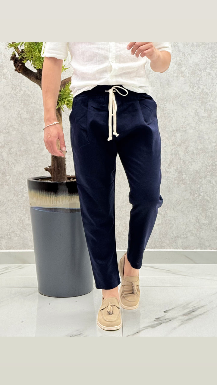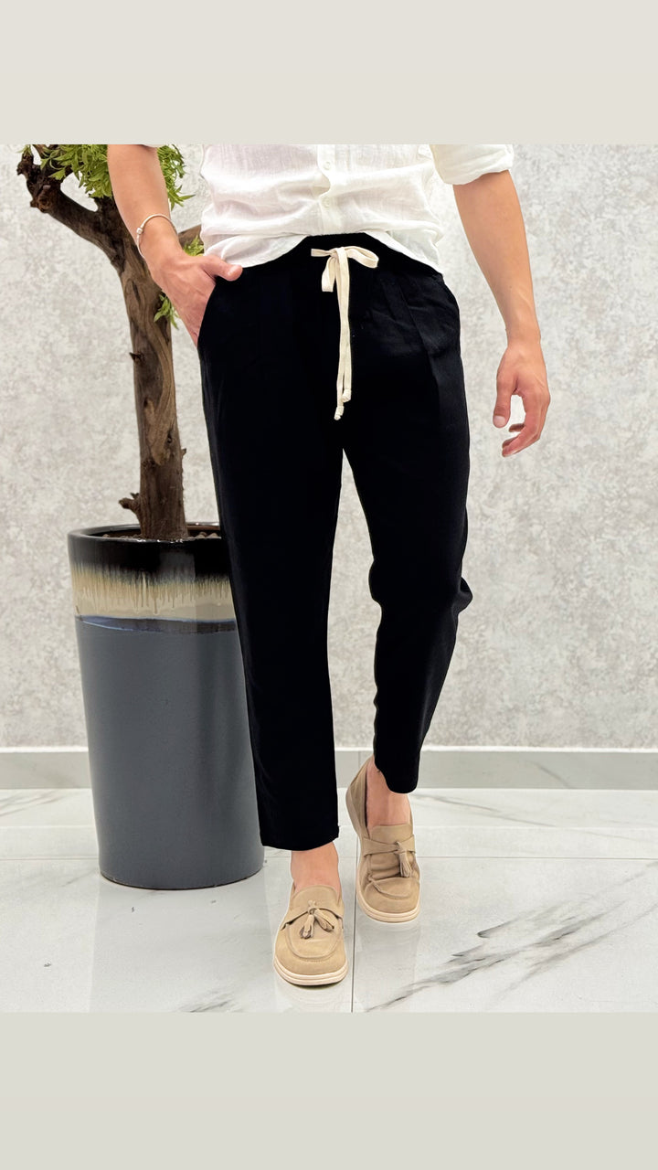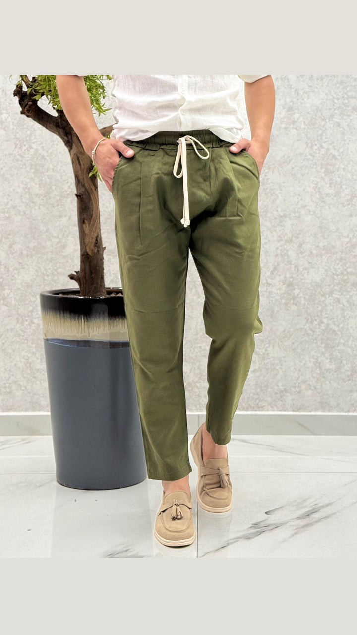 Pantalaccio modello Capri, tessuto misto lino, elastico in vita e laccetti. Vestibilità regolare, il modello 1,76 per 73kg indossa M