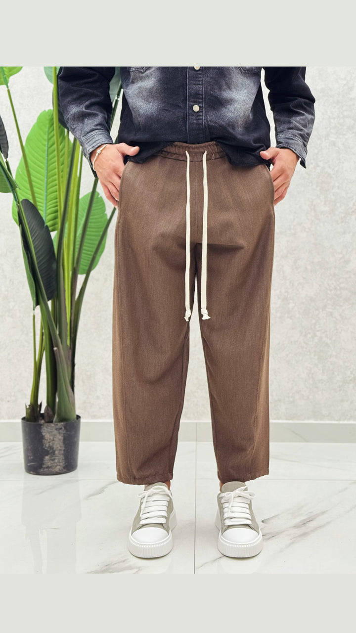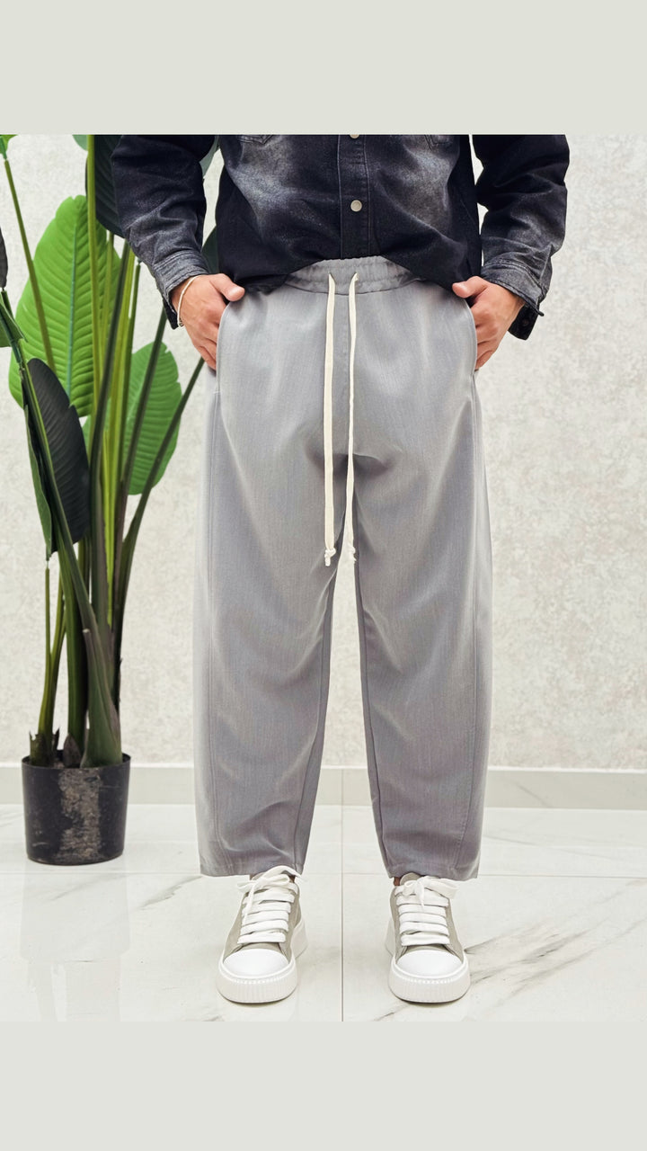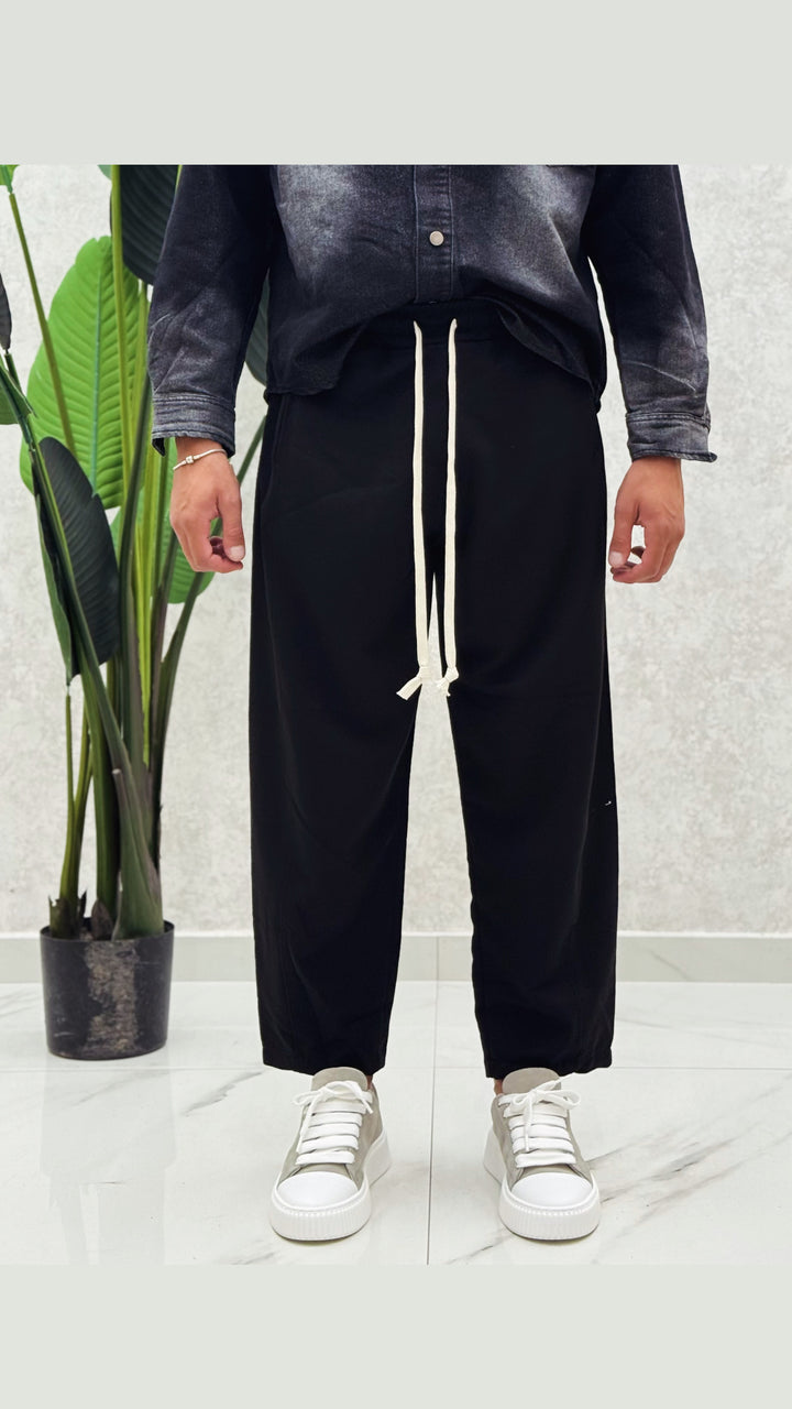Pantalaccio modello japan con elastico e laccetti in vita, fondo largo e tasca America. Vestibilità regolare, il modello 1,76 per 73kg indossa S
