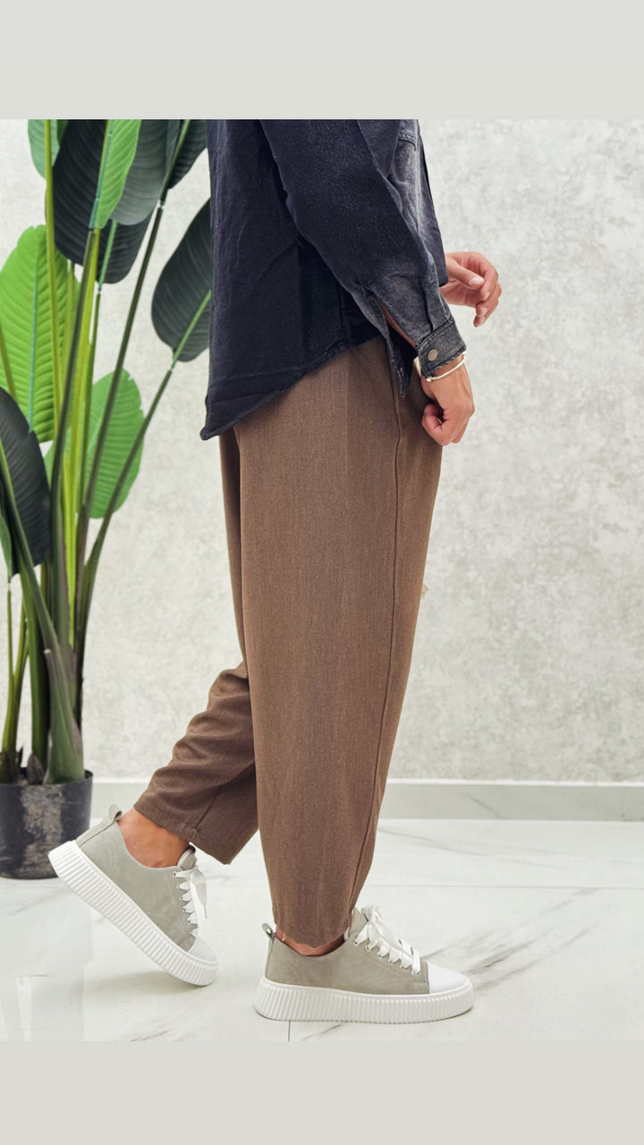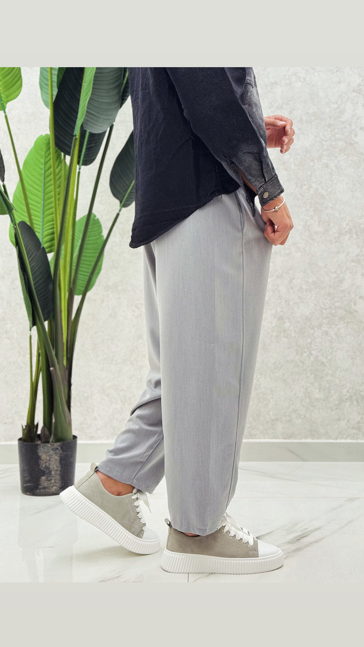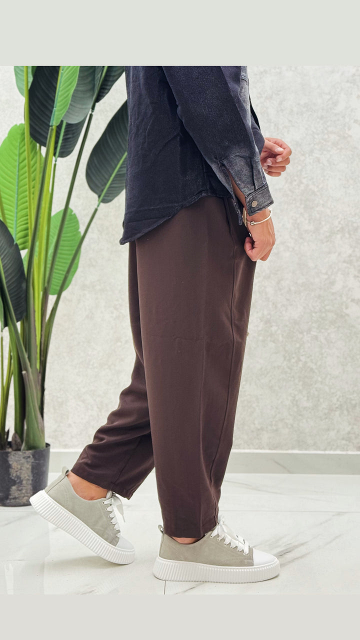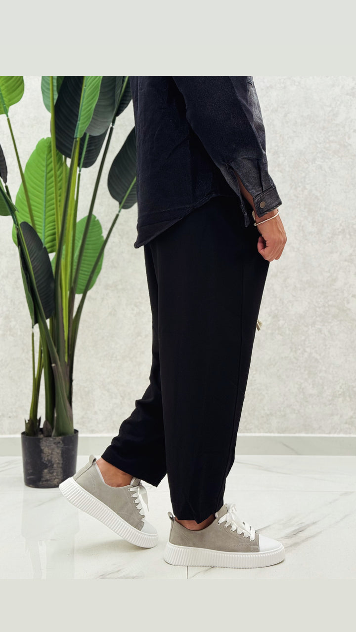 Pantalaccio modello japan con elastico e laccetti in vita, fondo largo e tasca America. Vestibilità regolare, il modello 1,76 per 73kg indossa S