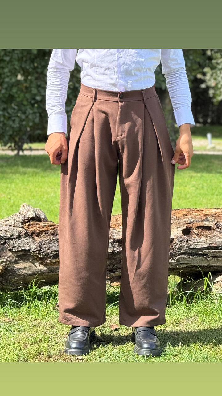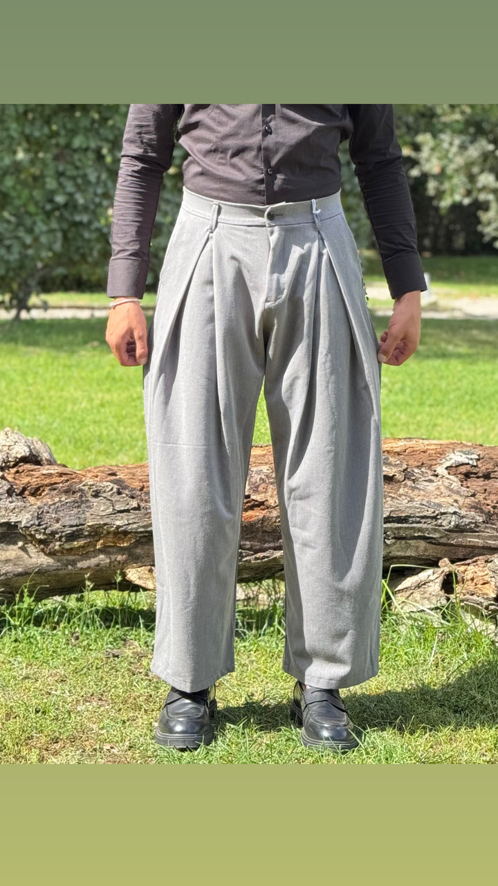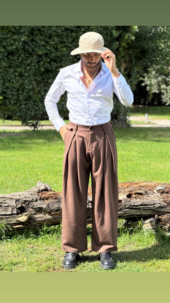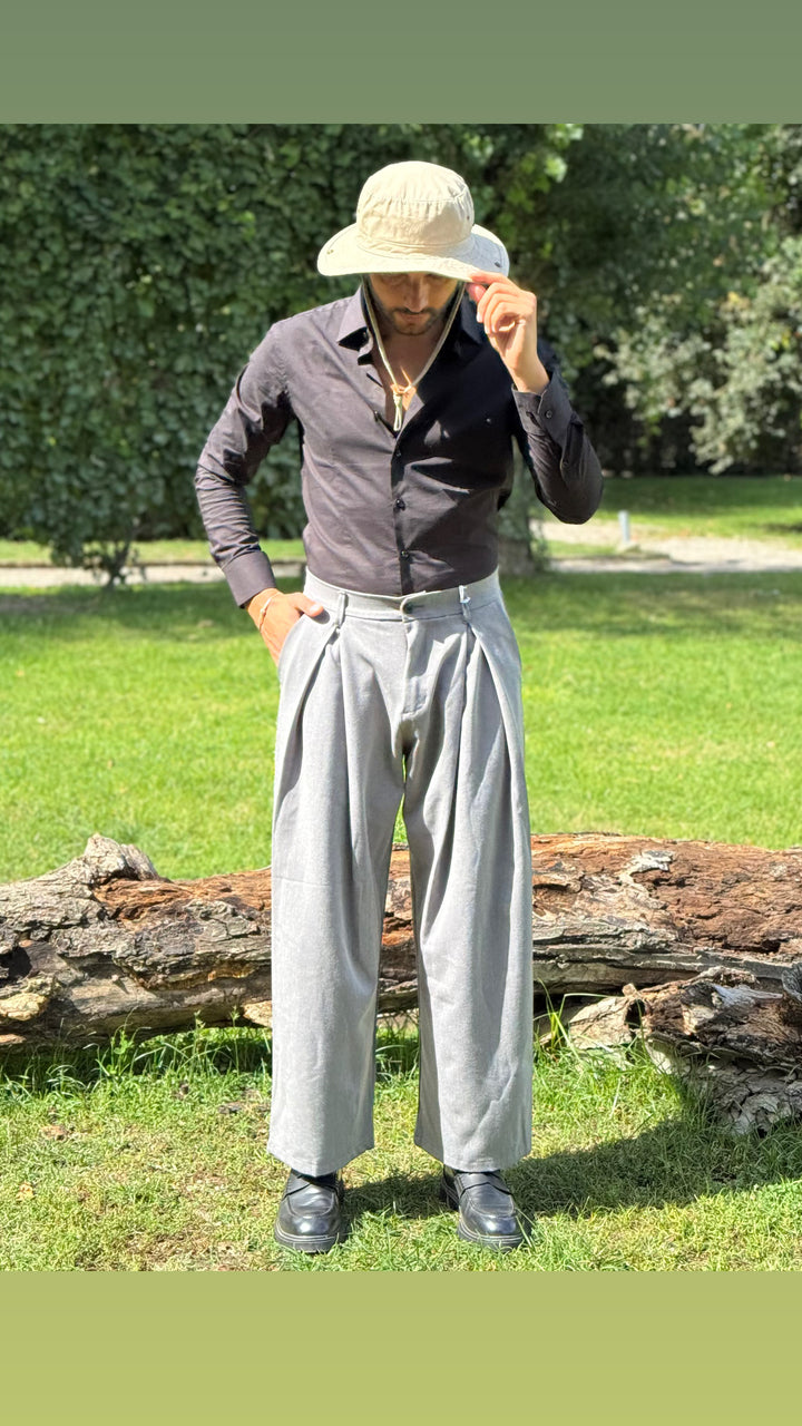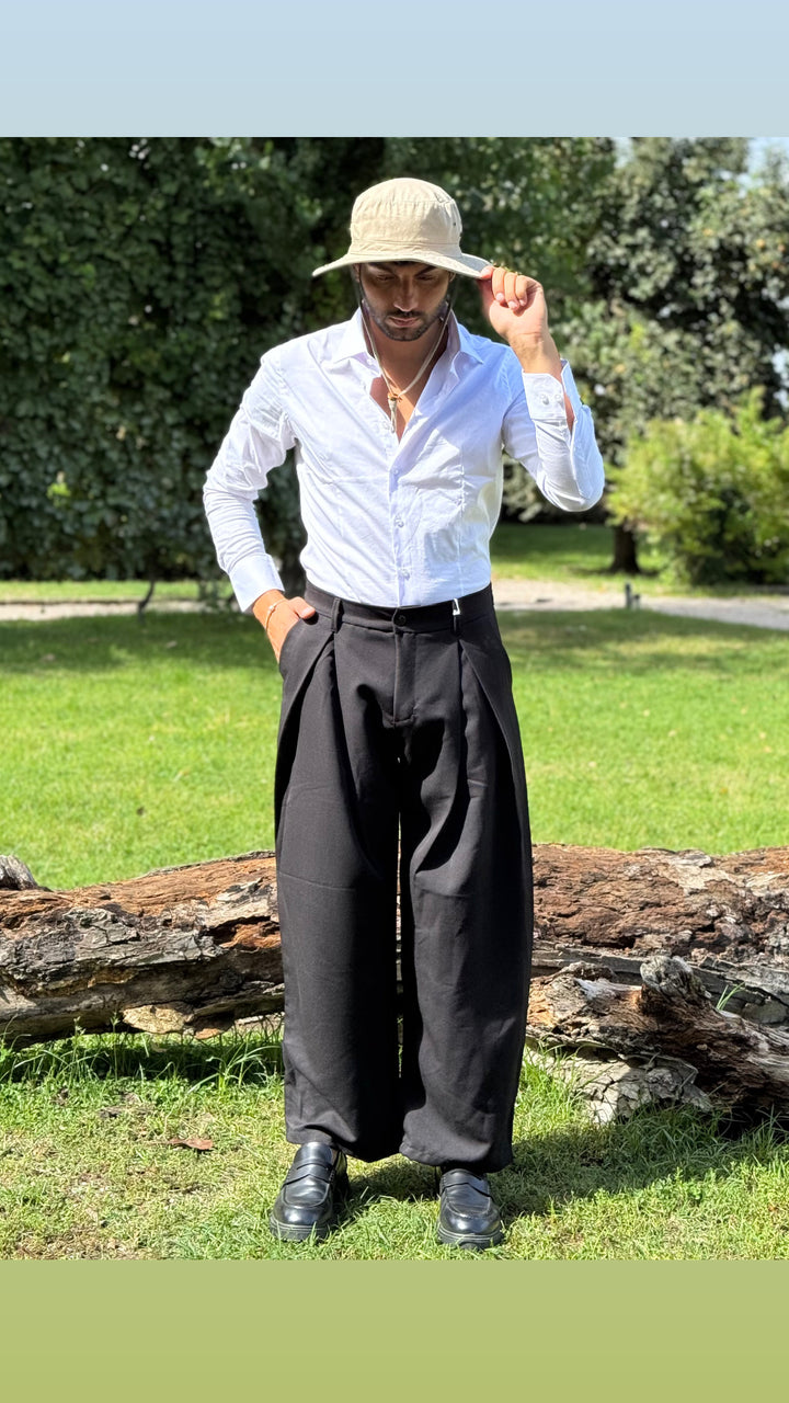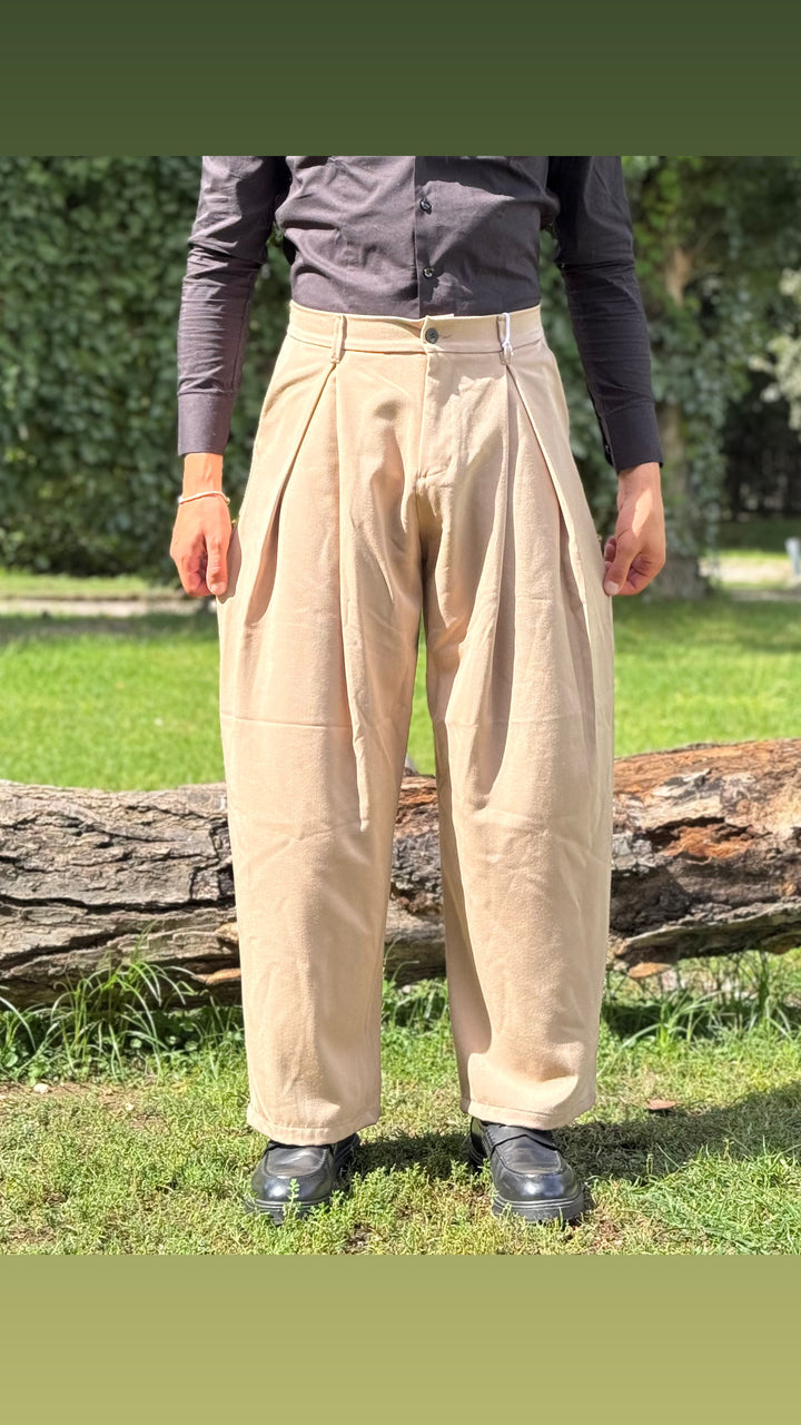 Pantalone fondo largo effetto ballon con doppia pence, bottone centrale, elastico sul retro e tasca a toppa. Vestibilità regolare, il modello 1,76 per 73kg indossa S