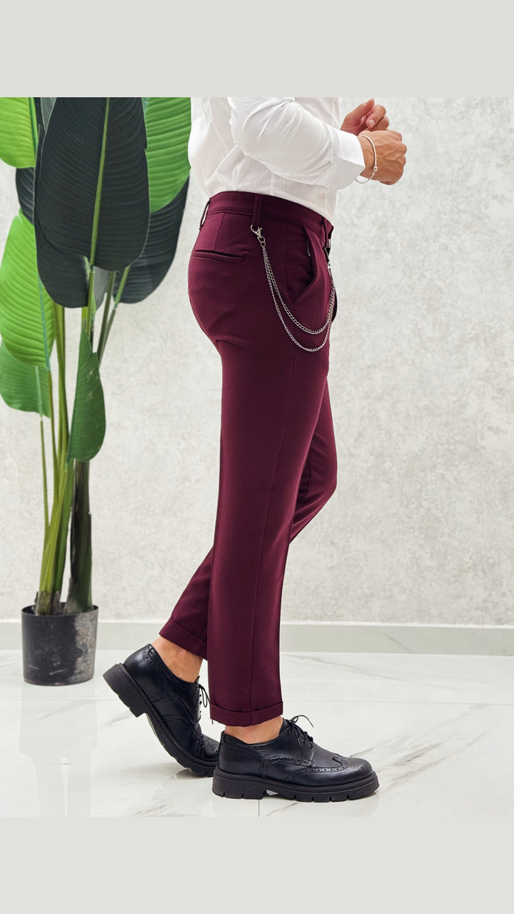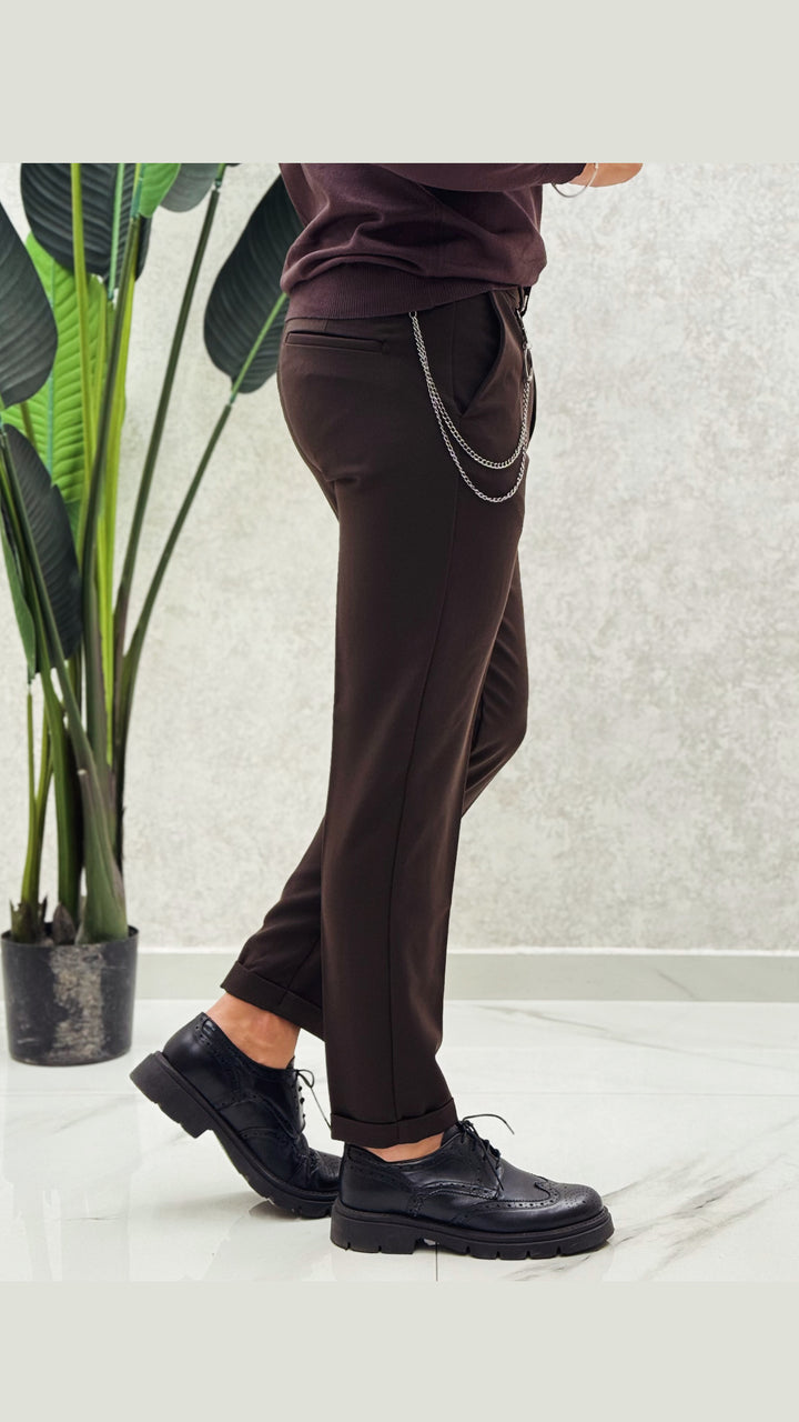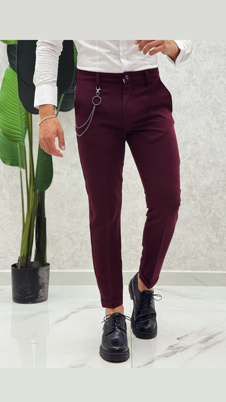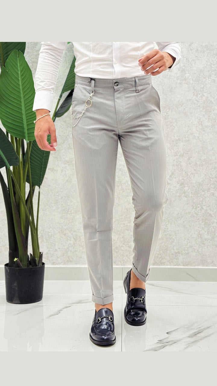 Pantalone slim fit, bottone centrale con risvoltino sul fondo e tasca sul retro, accessorio in omaggio. Vestibilità slim, il modello 1,76 per 73kg indossa 46
