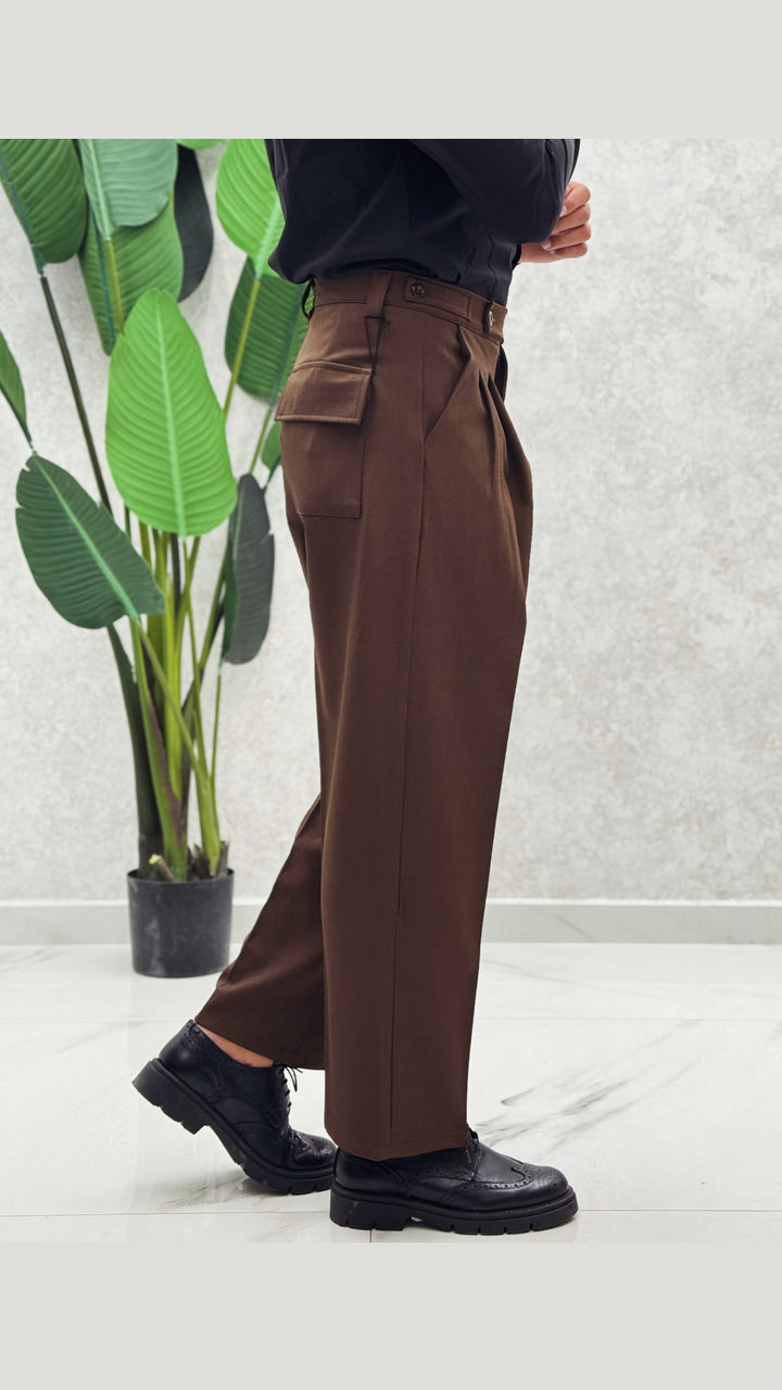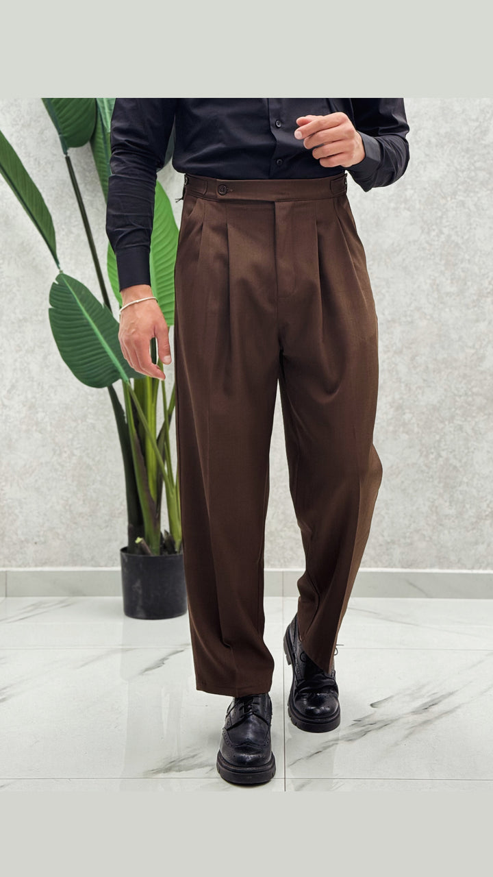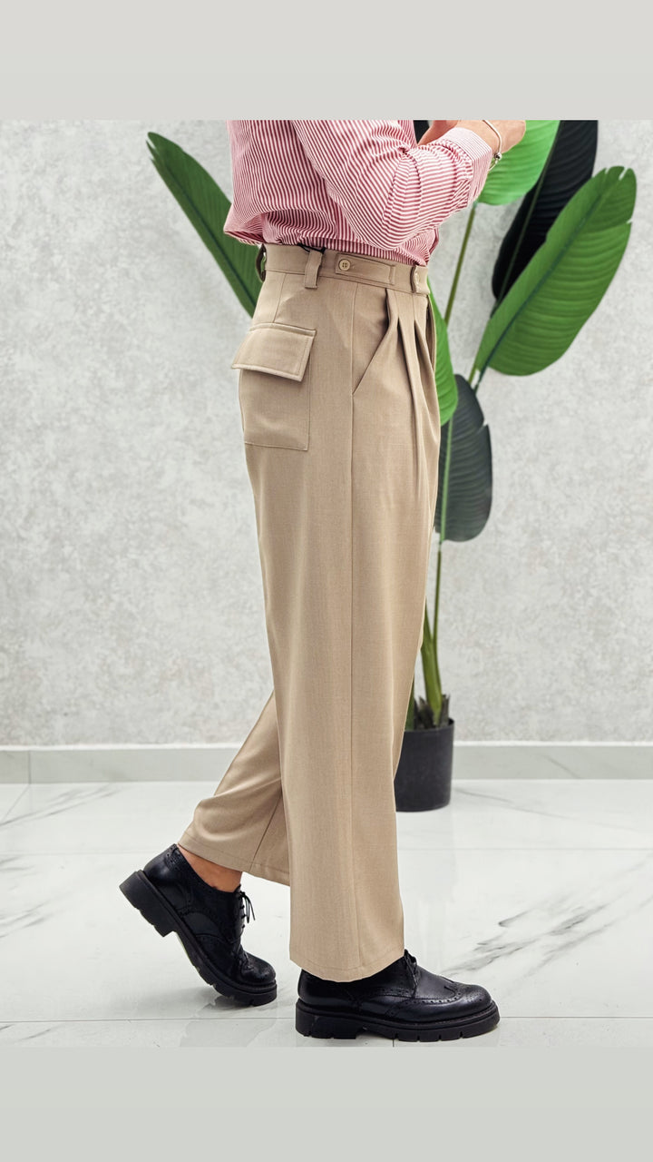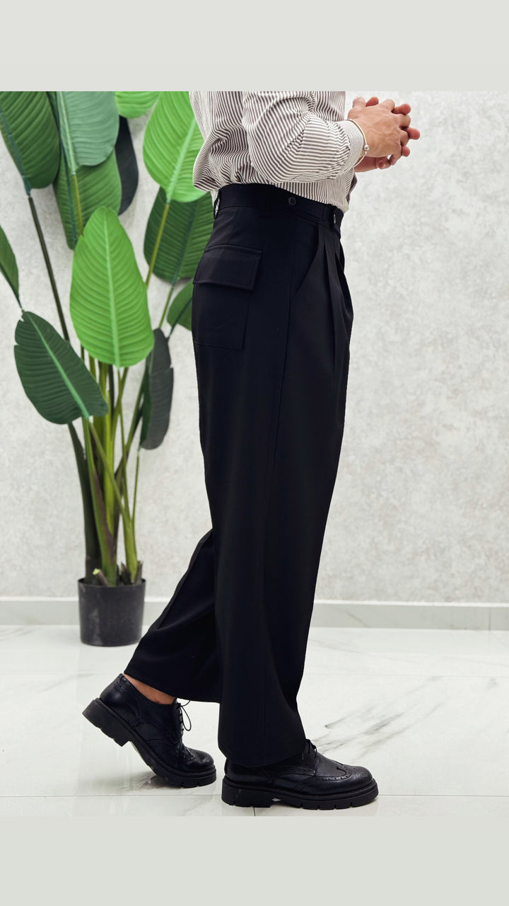 Pantalone a fondo largo, doppia pence su entrambi i lati, doppio bottone laterale e tasca singola con pattina. Vestibilità regolare, il modello 1.76 per 73kg indossa 46.