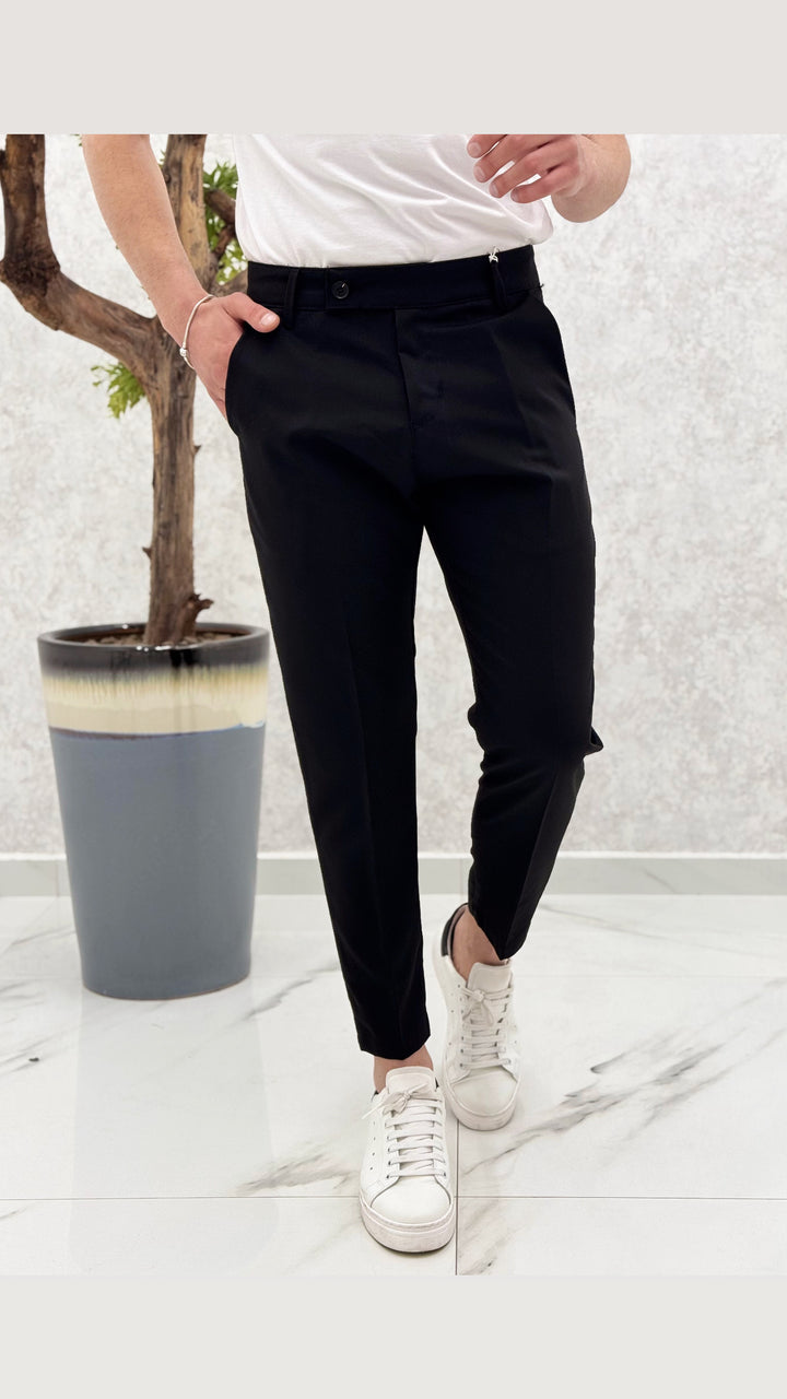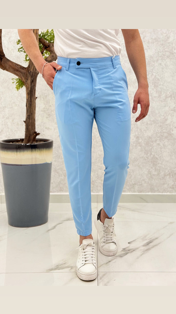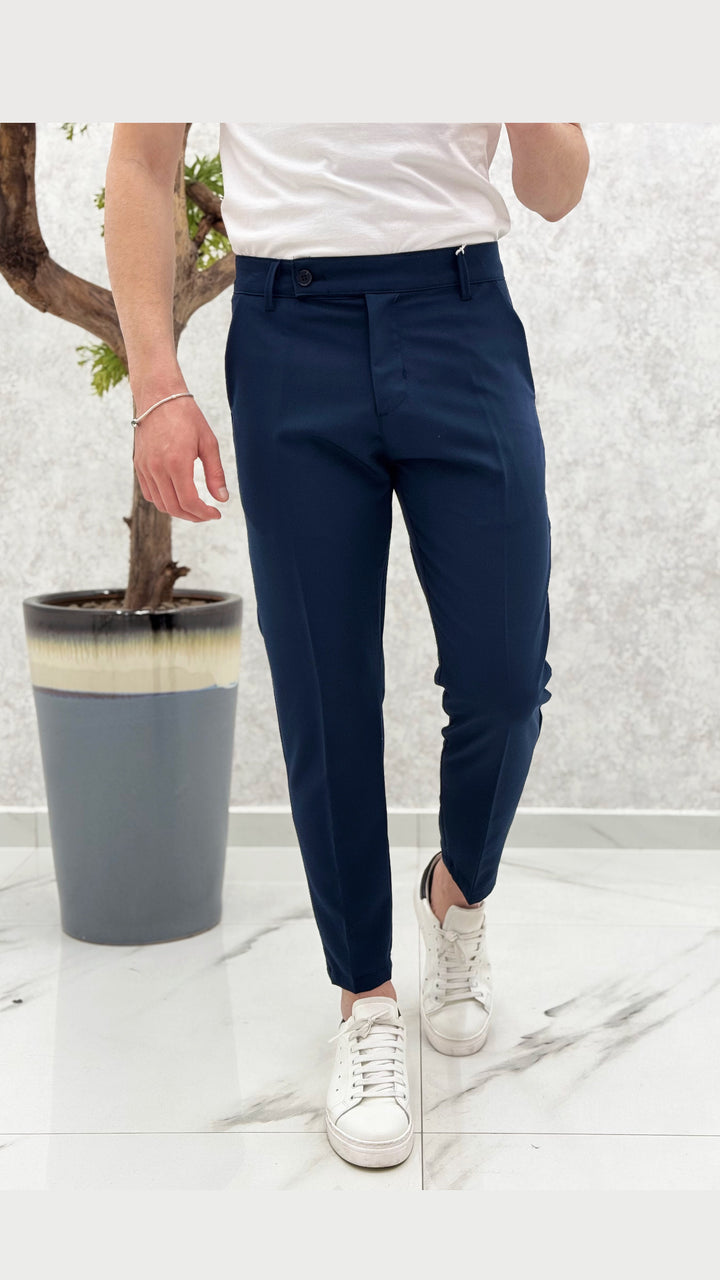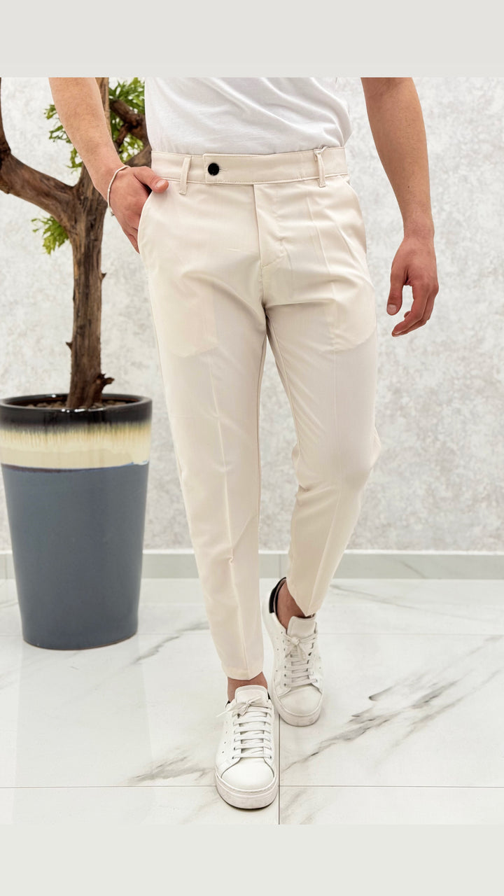 Pantalone con bottone laterale, tessuto fresco. Vestibilità slim, il modello 1,76 per 73kg indossa M