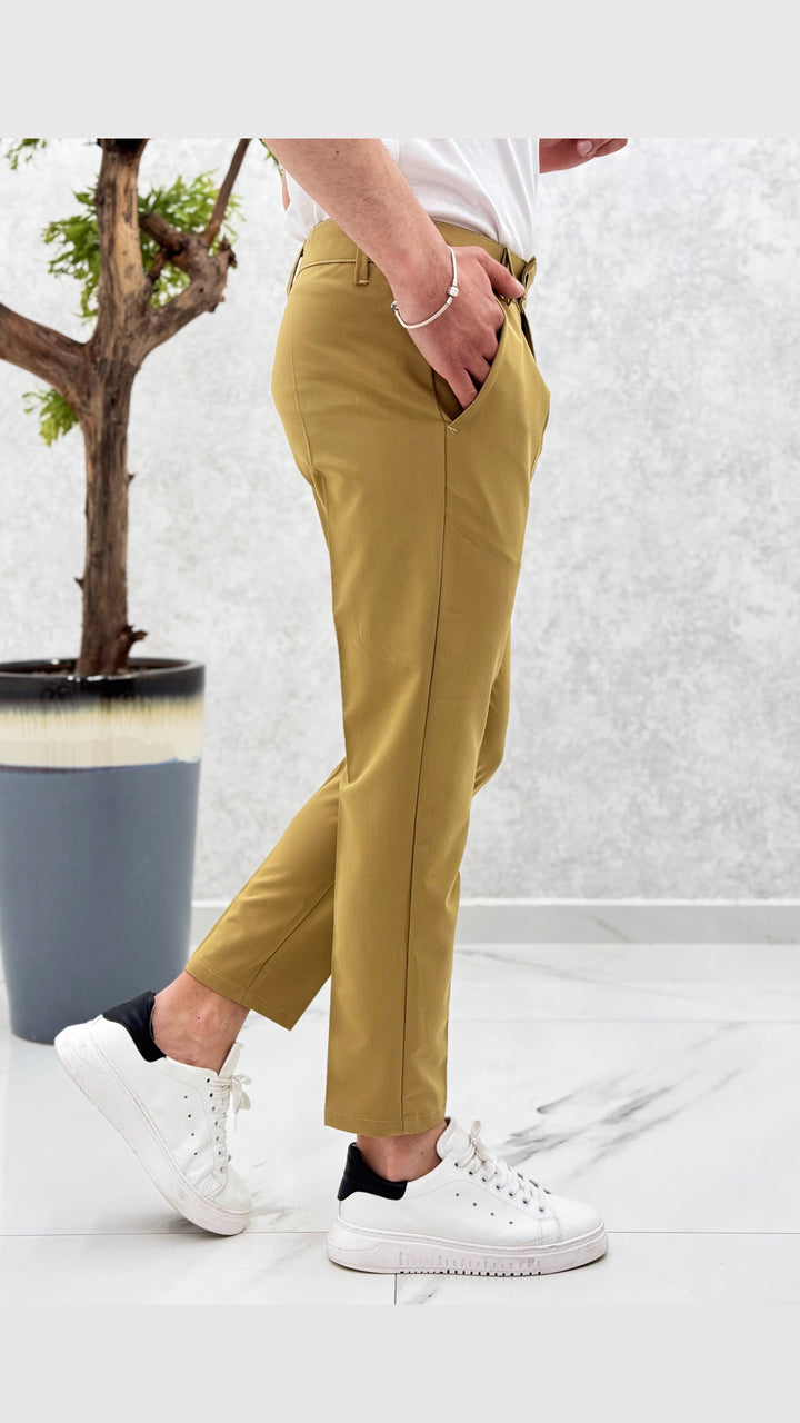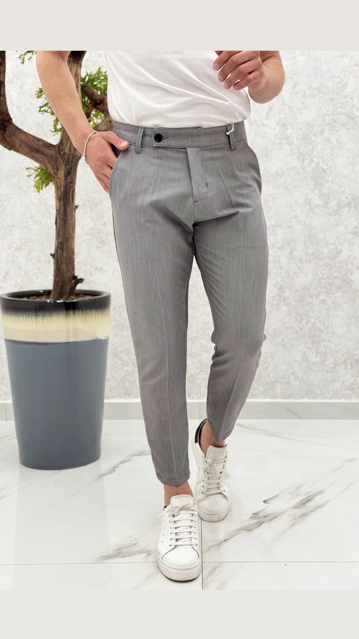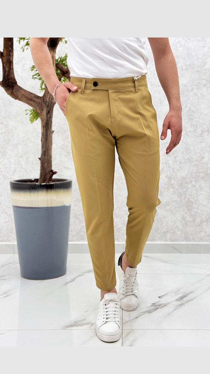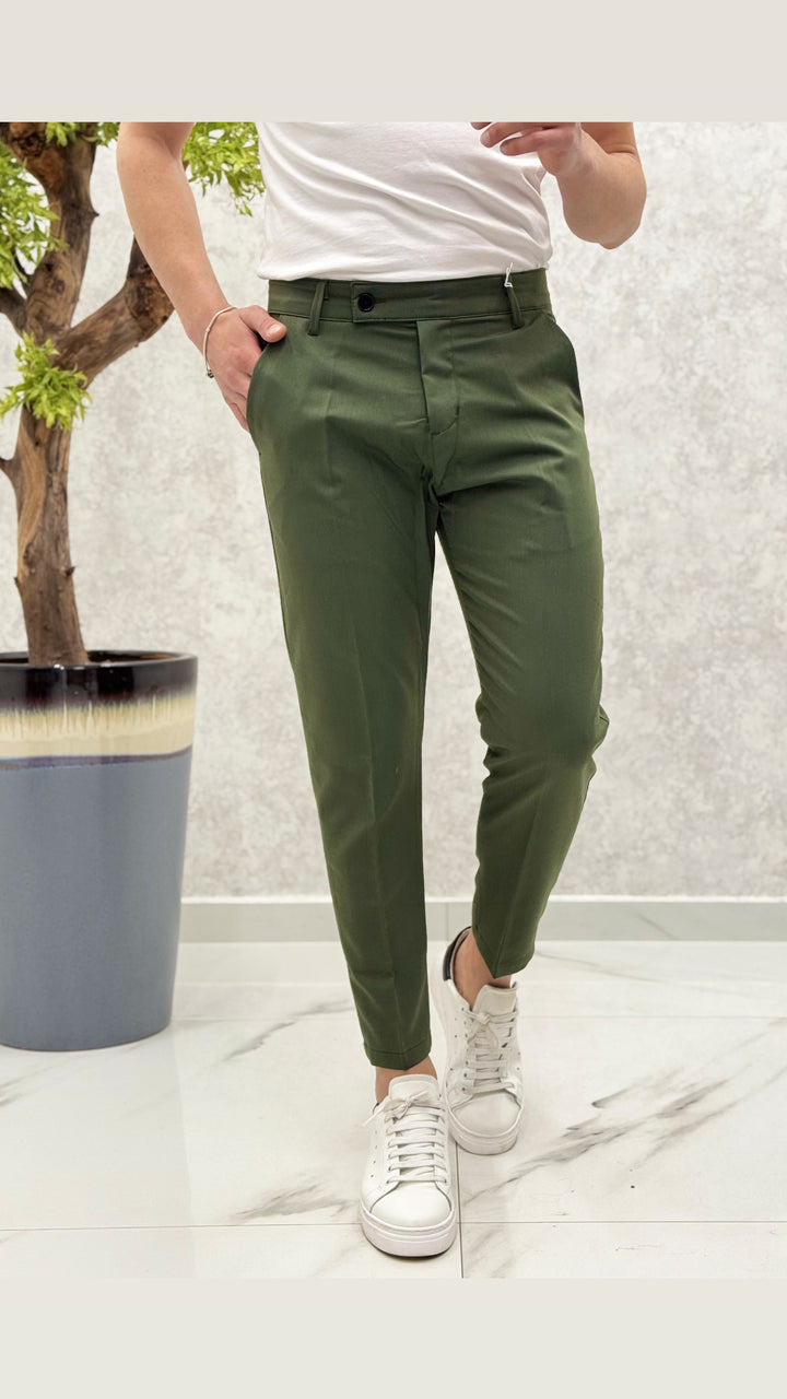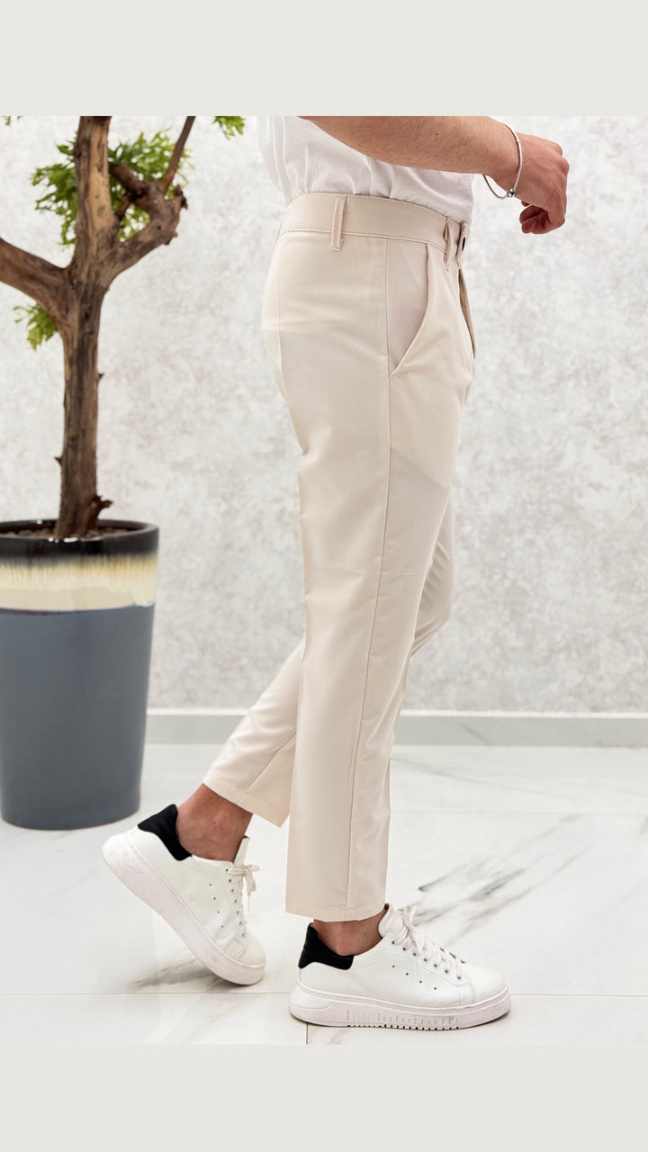 Pantalone con bottone laterale, tessuto fresco. Vestibilità slim, il modello 1,76 per 73kg indossa M