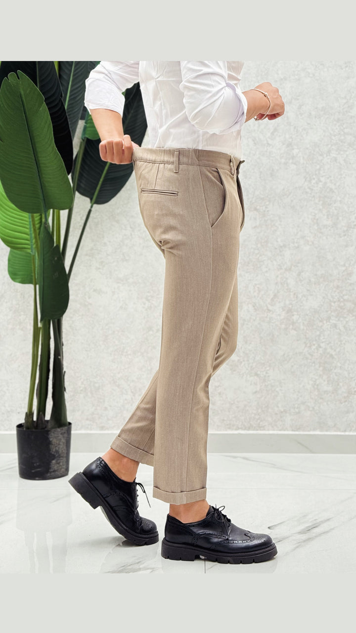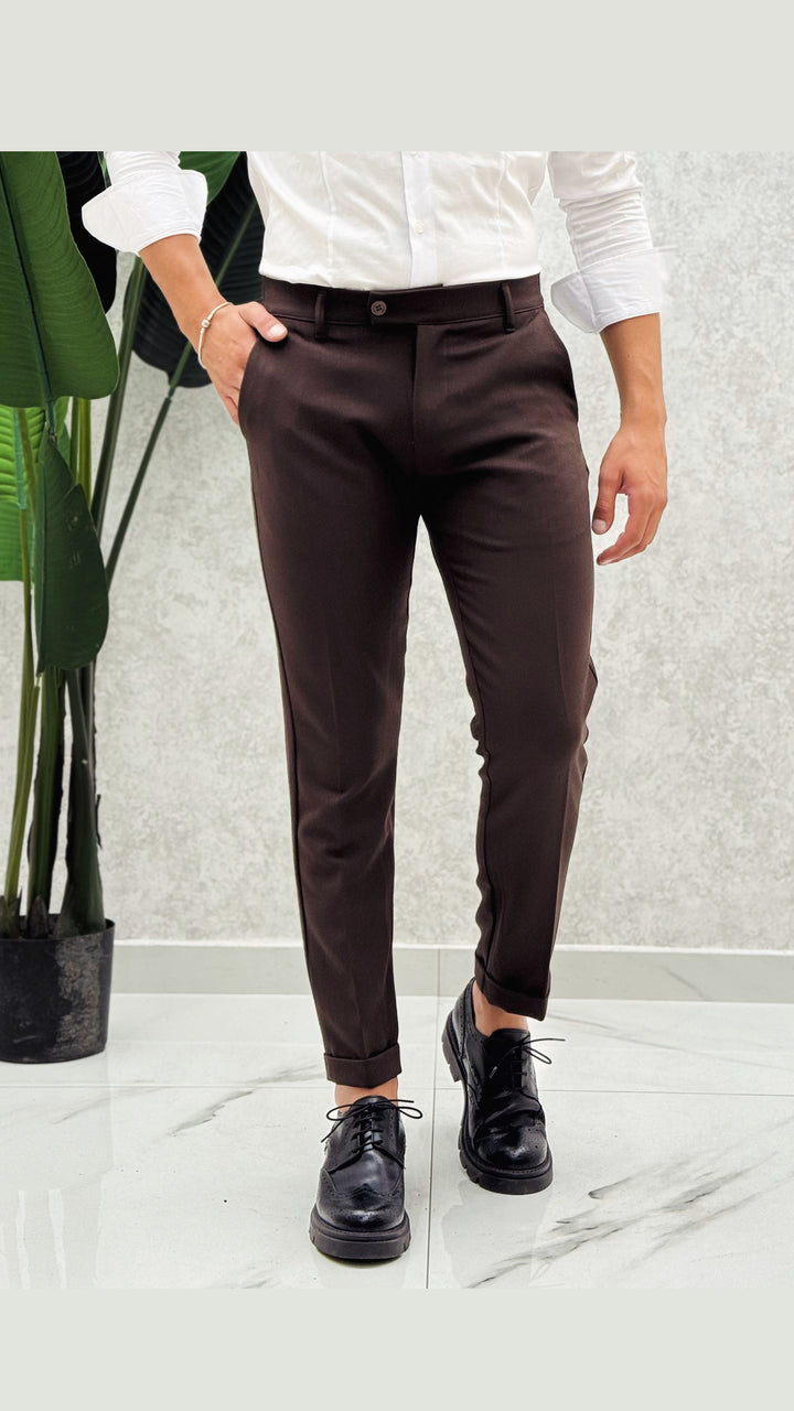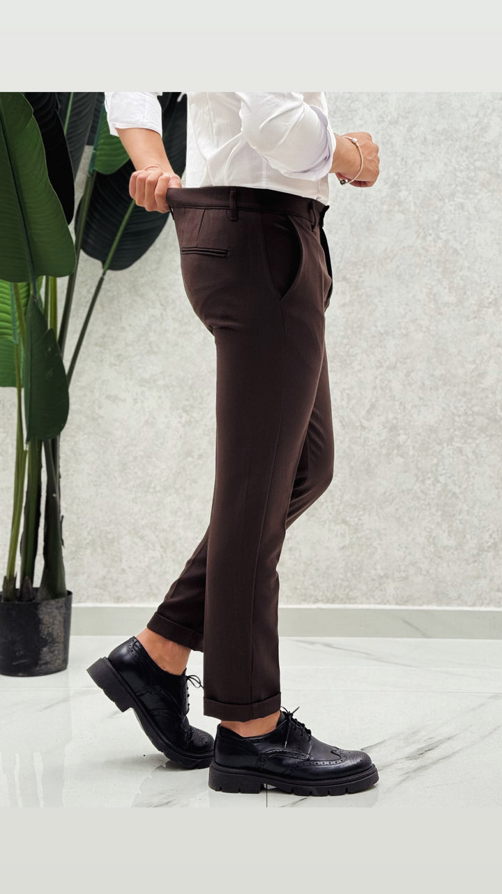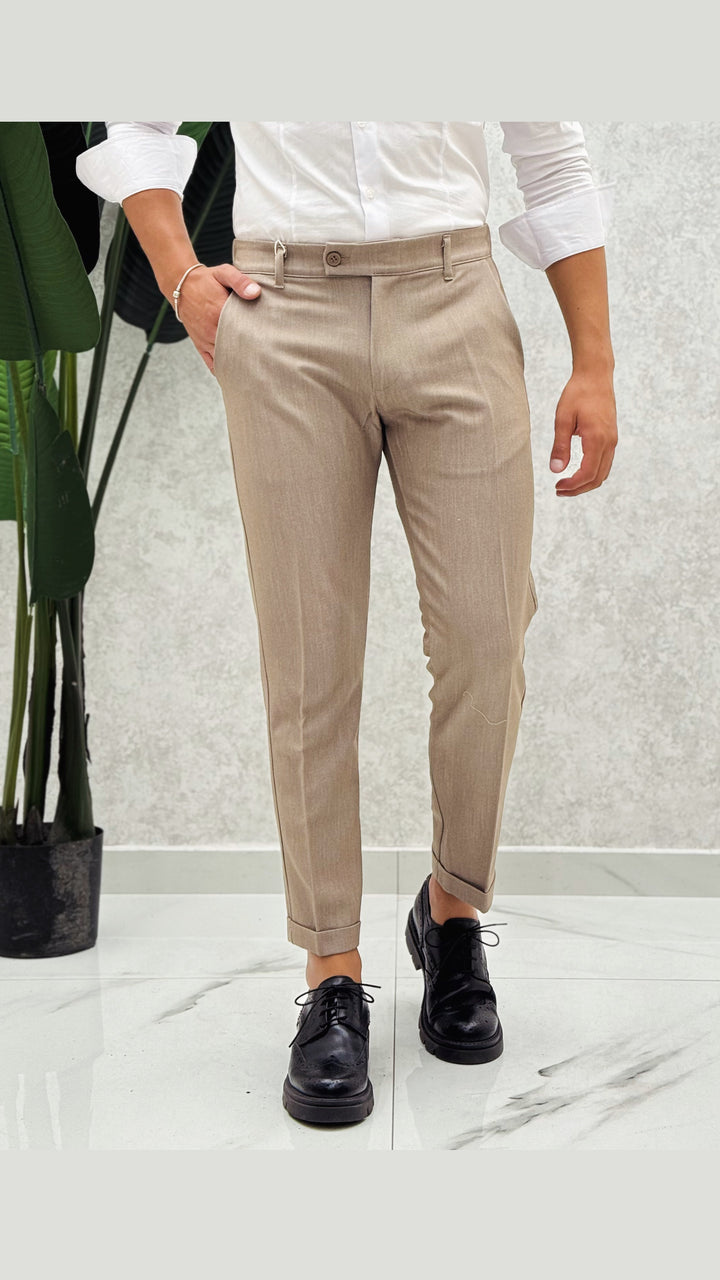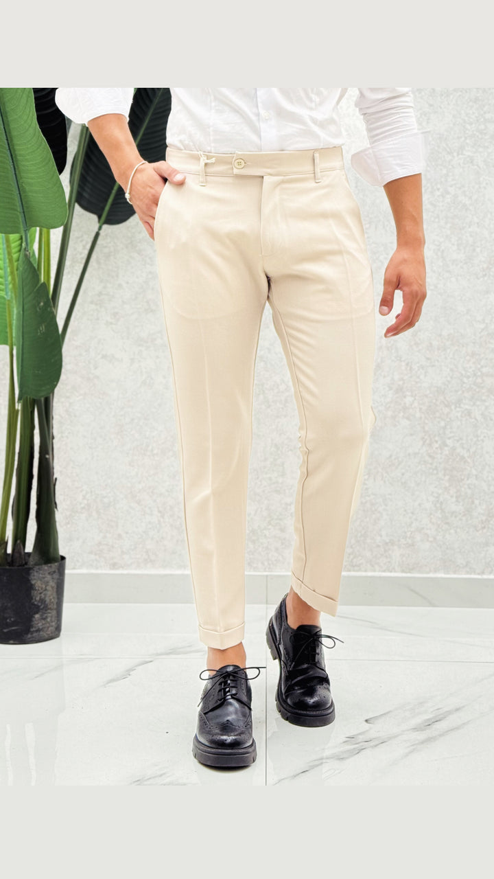 Pantalone sartoriale con bottone laterale, molla sul retro, tasca America e risvoltino sul fondo. Vestibilità regolare, il modello 1,76 per 73kg indossa 46
