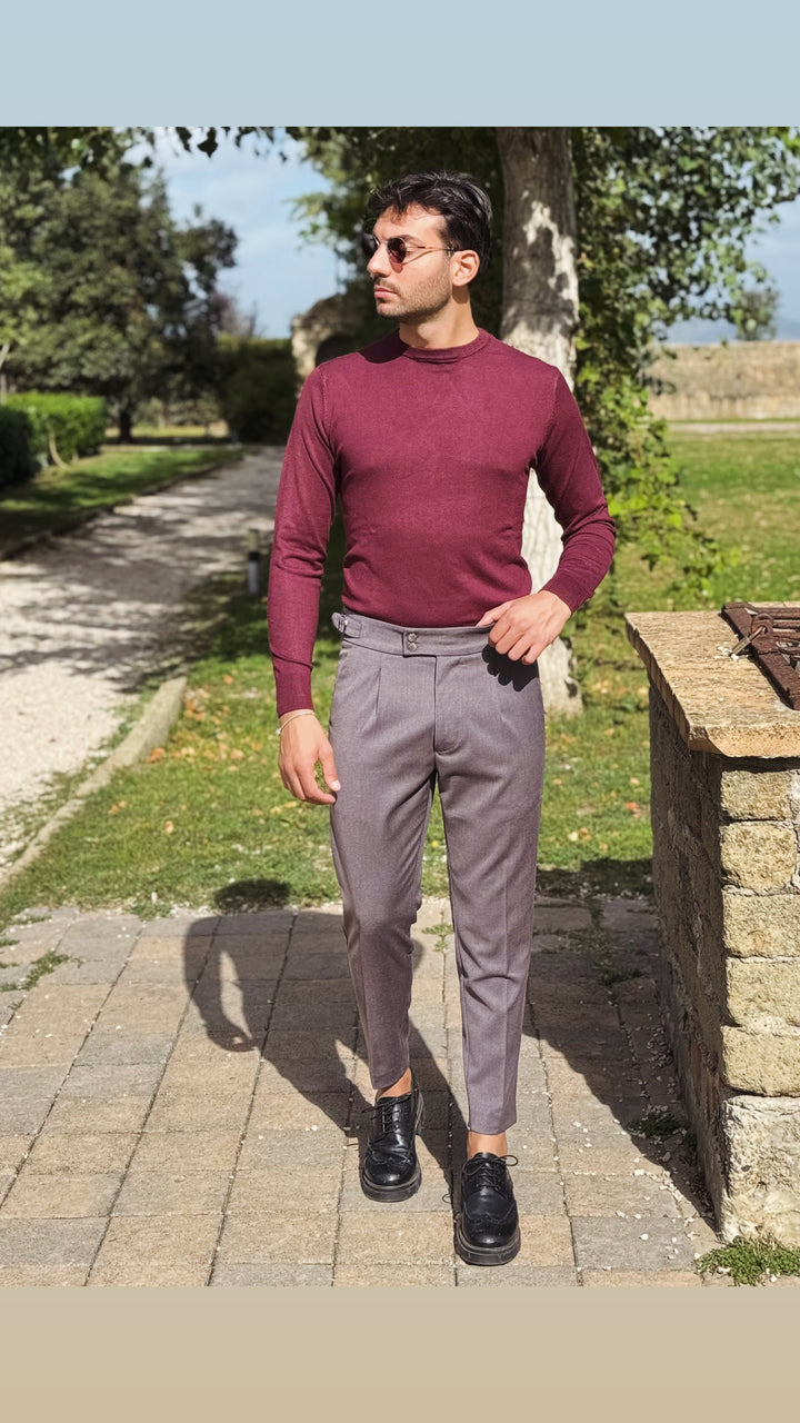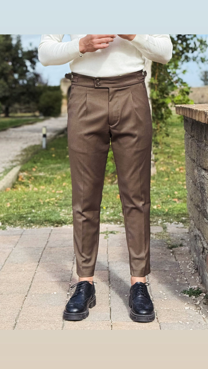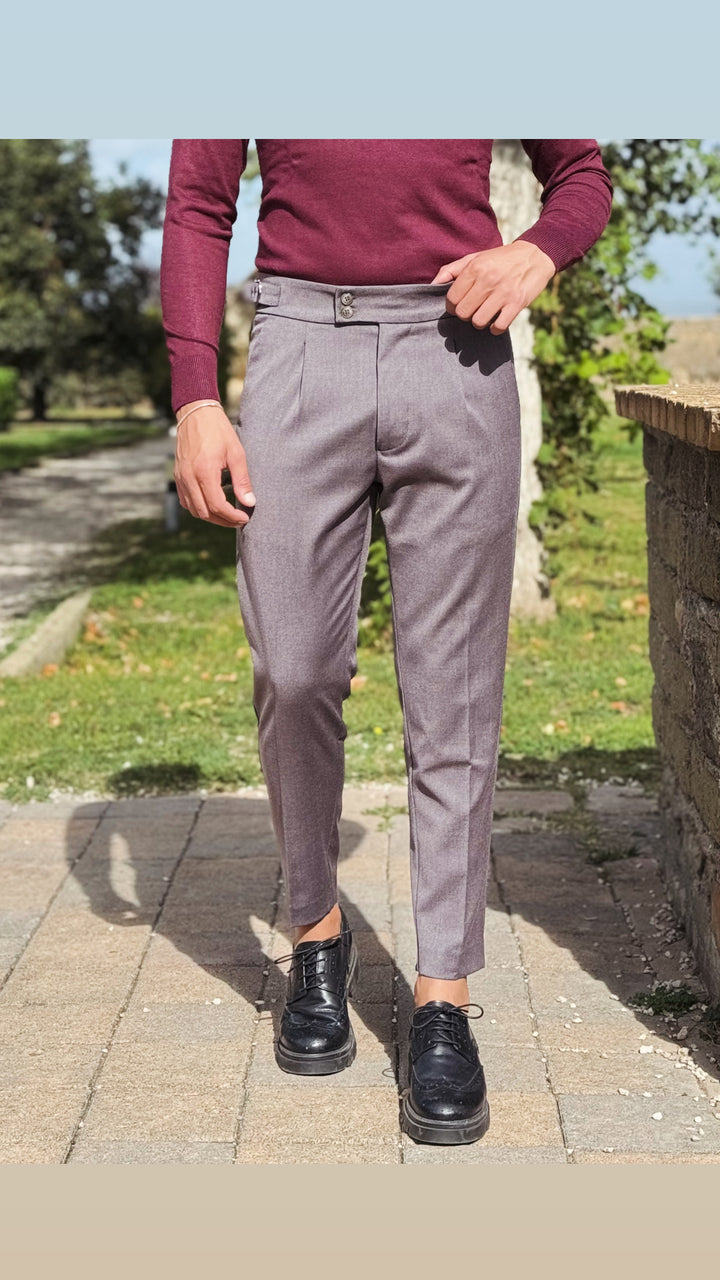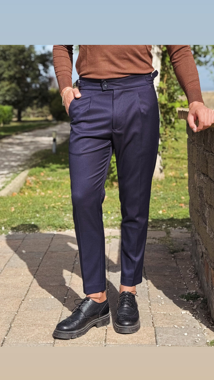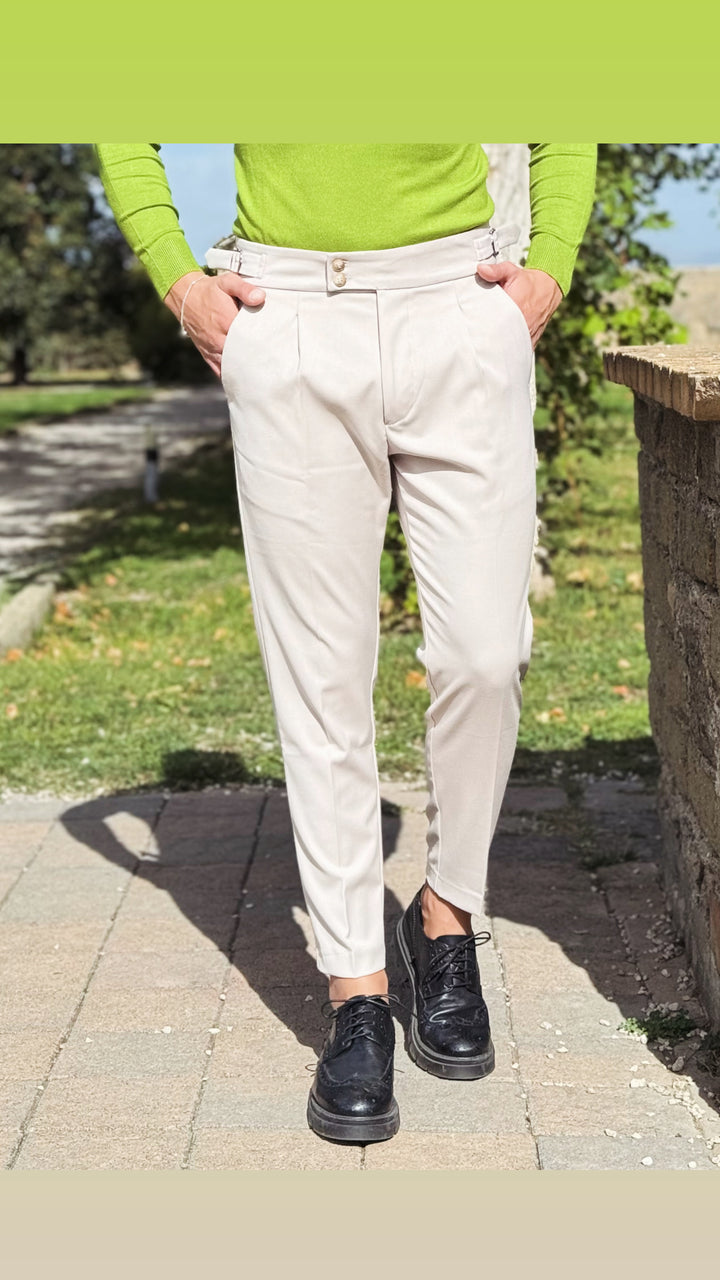 Pantalone sartoriale a vita alta con due bottoni laterali, clip in metallo regolabili laterali, pence sul davanti e tasche a filo con bottone sul retro. Vestibilità slim, il modello 1.76 per 73kg indossa 46