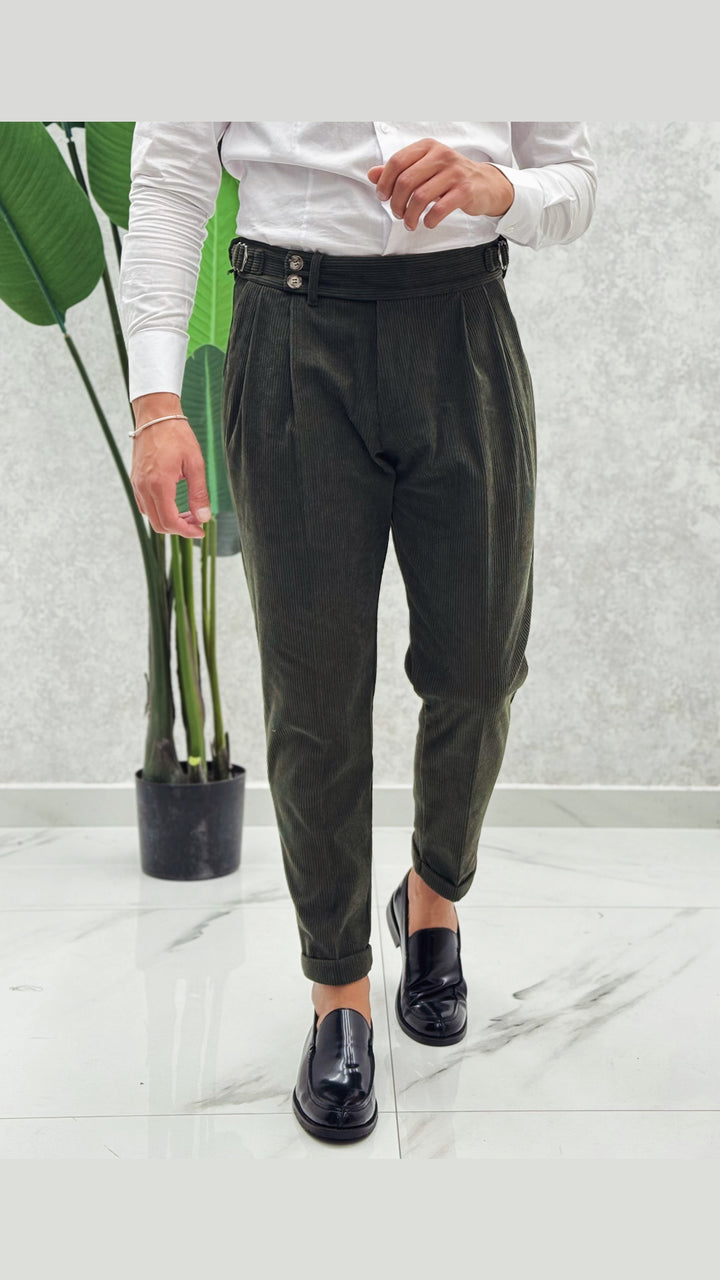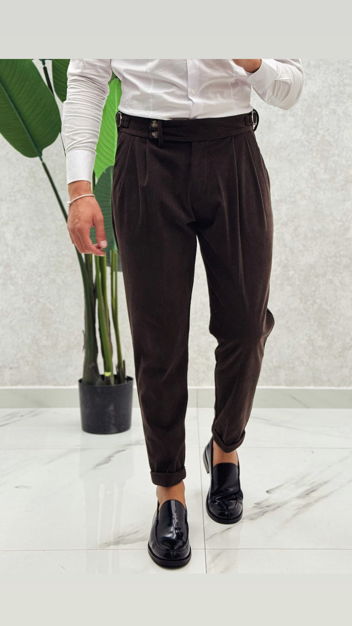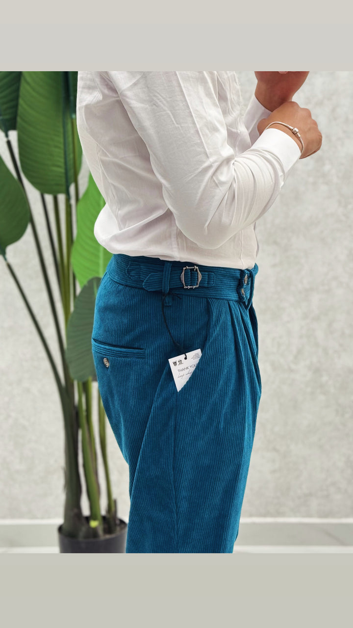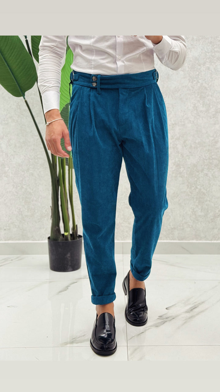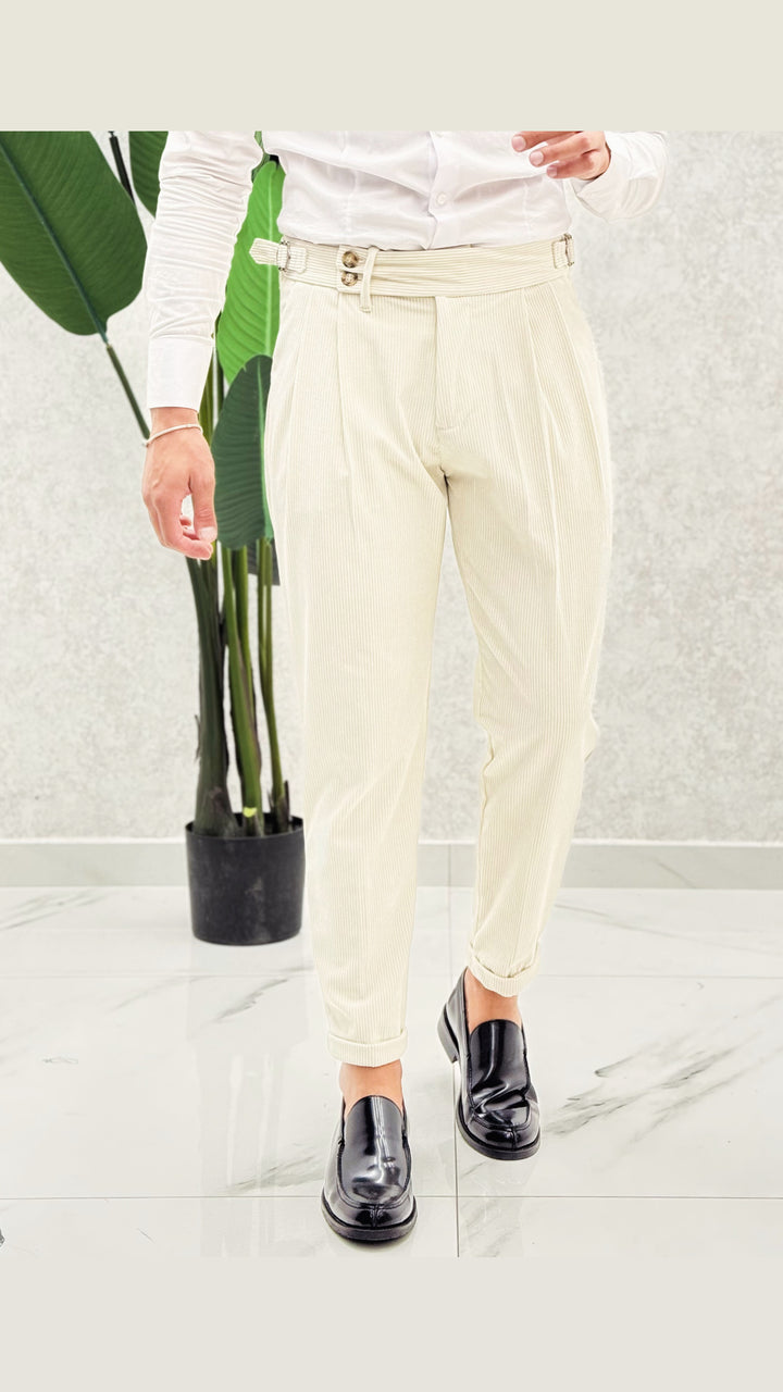 Pantalone vita alta in costine velluto, doppio bottone laterale, doppia clip, doppia pence ad entrambi i lati e risvoltino cucito sul fondo. Vestibilità slim, il modello 1.76 per 73kg indossa 46