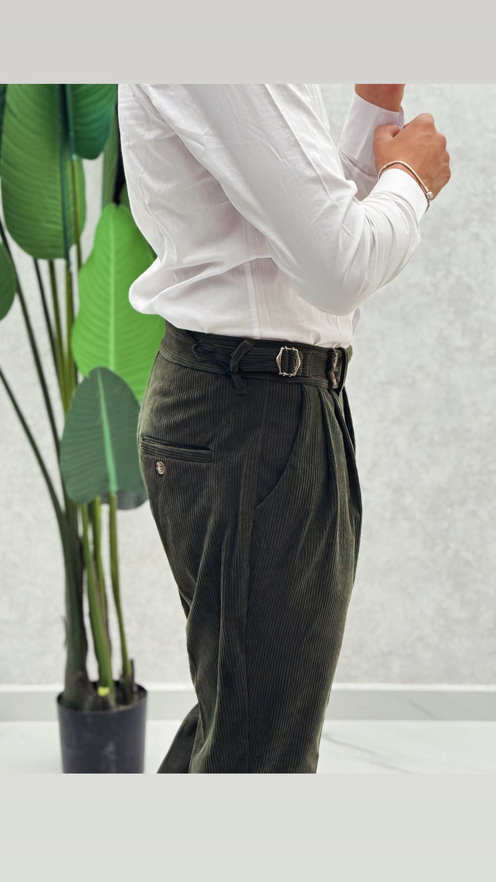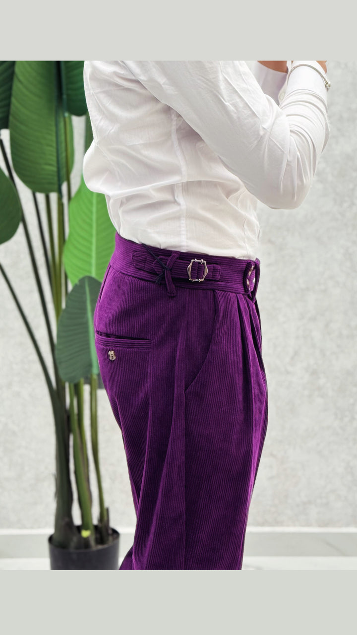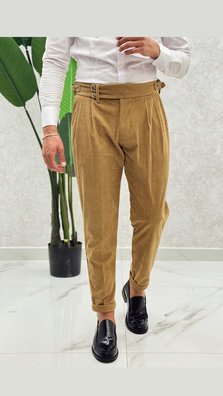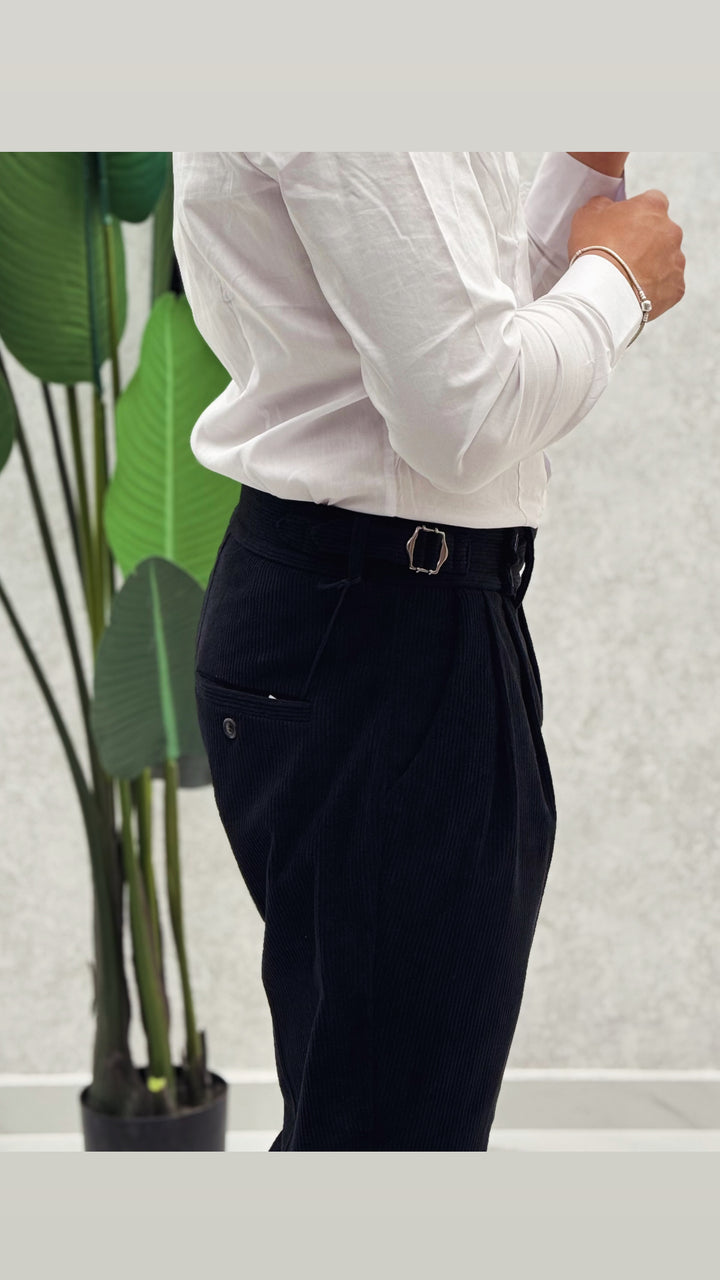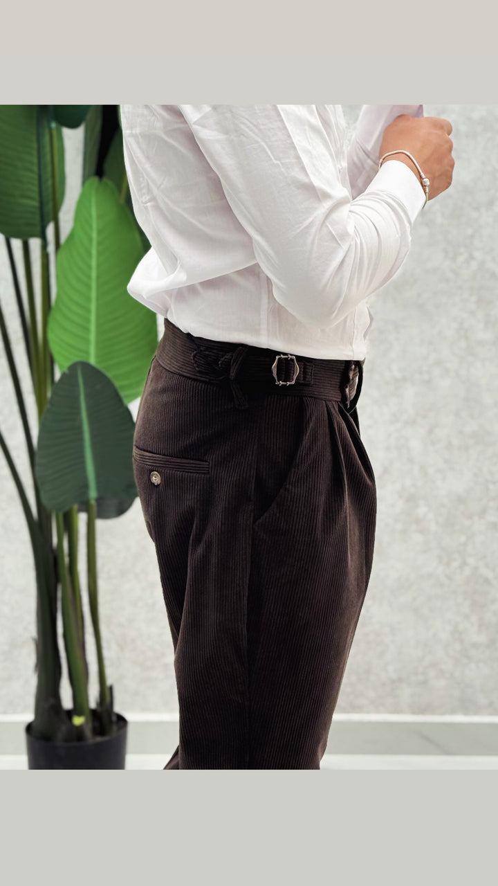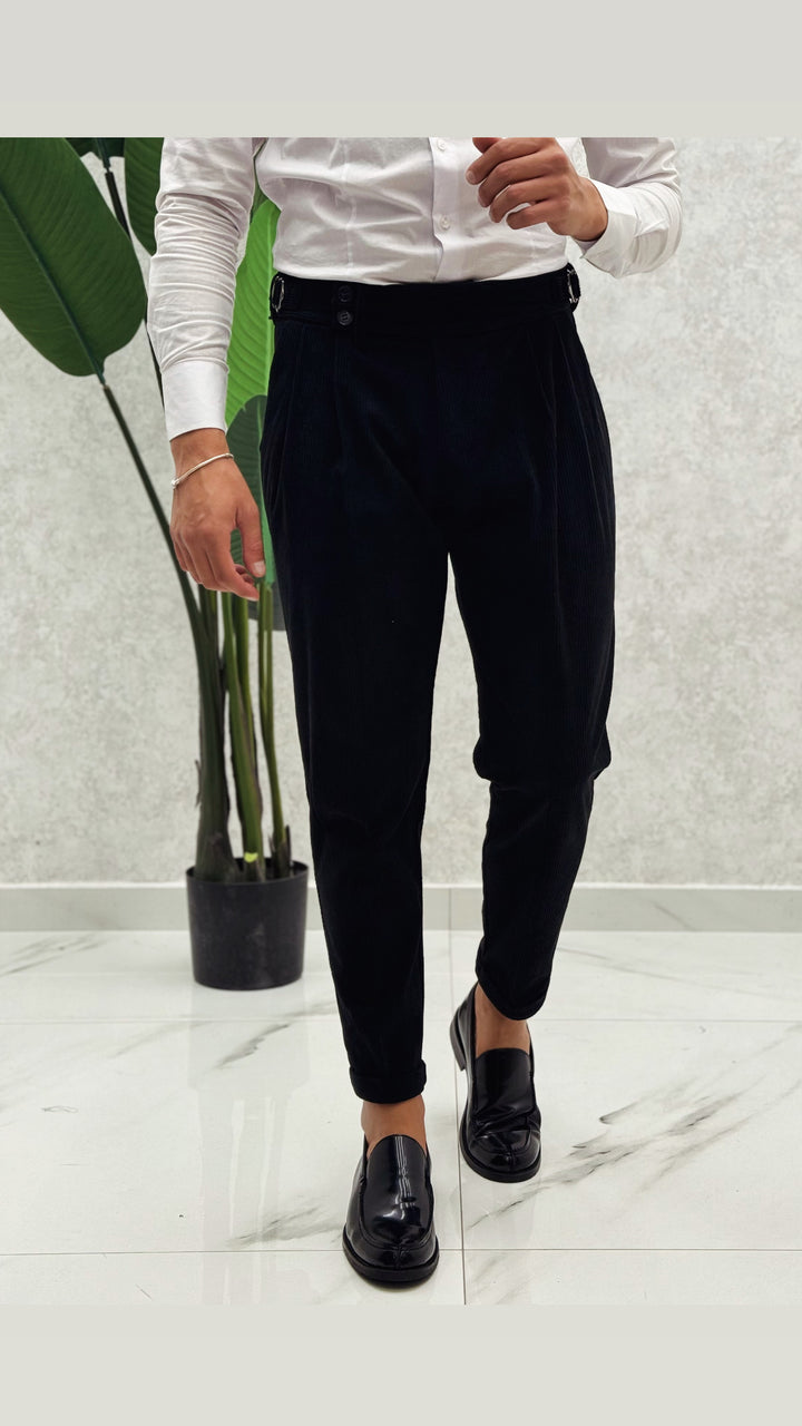 Pantalone vita alta in costine velluto, doppio bottone laterale, doppia clip, doppia pence ad entrambi i lati e risvoltino cucito sul fondo. Vestibilità slim, il modello 1.76 per 73kg indossa 46