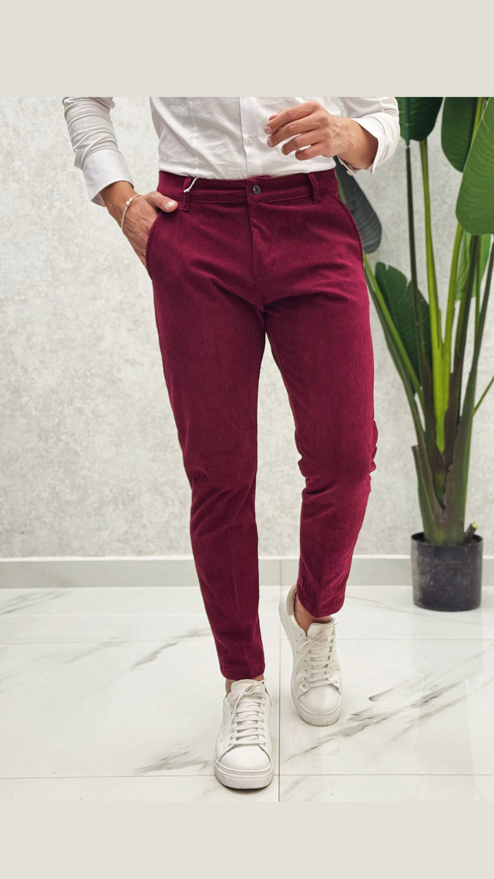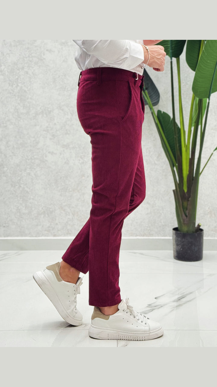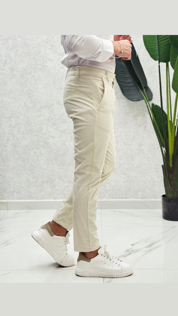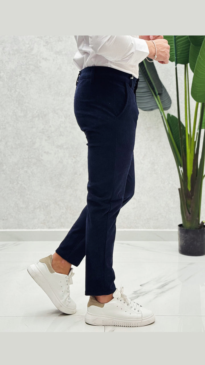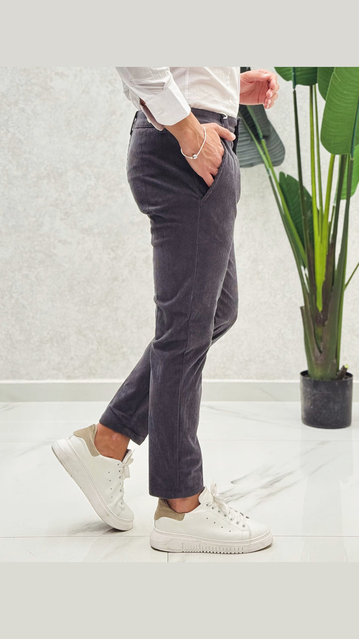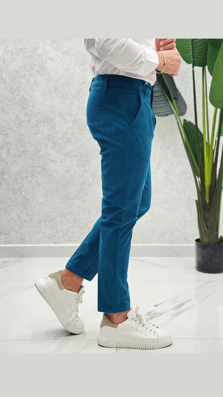 Pantalone in costine velluto, bottone centrale e privo di tasca sul retro. Vestibilità slim, il modello 1;76 per 73kg indossa M