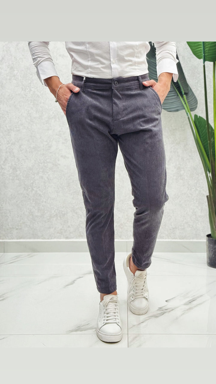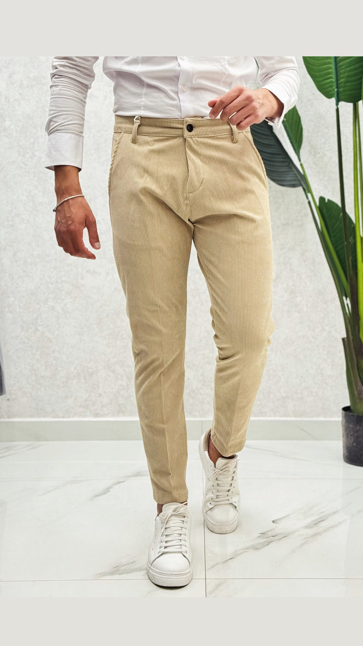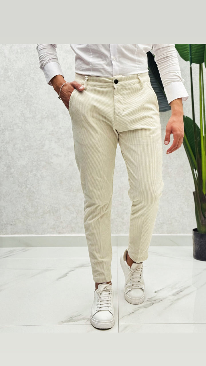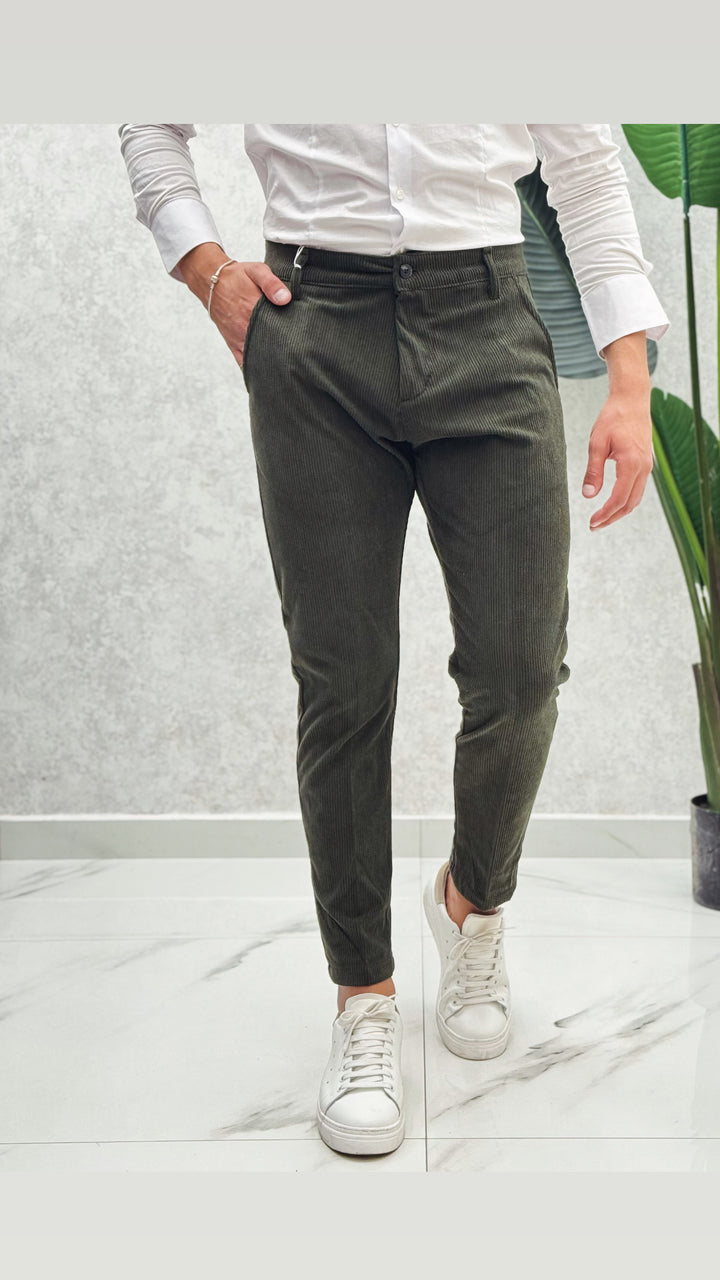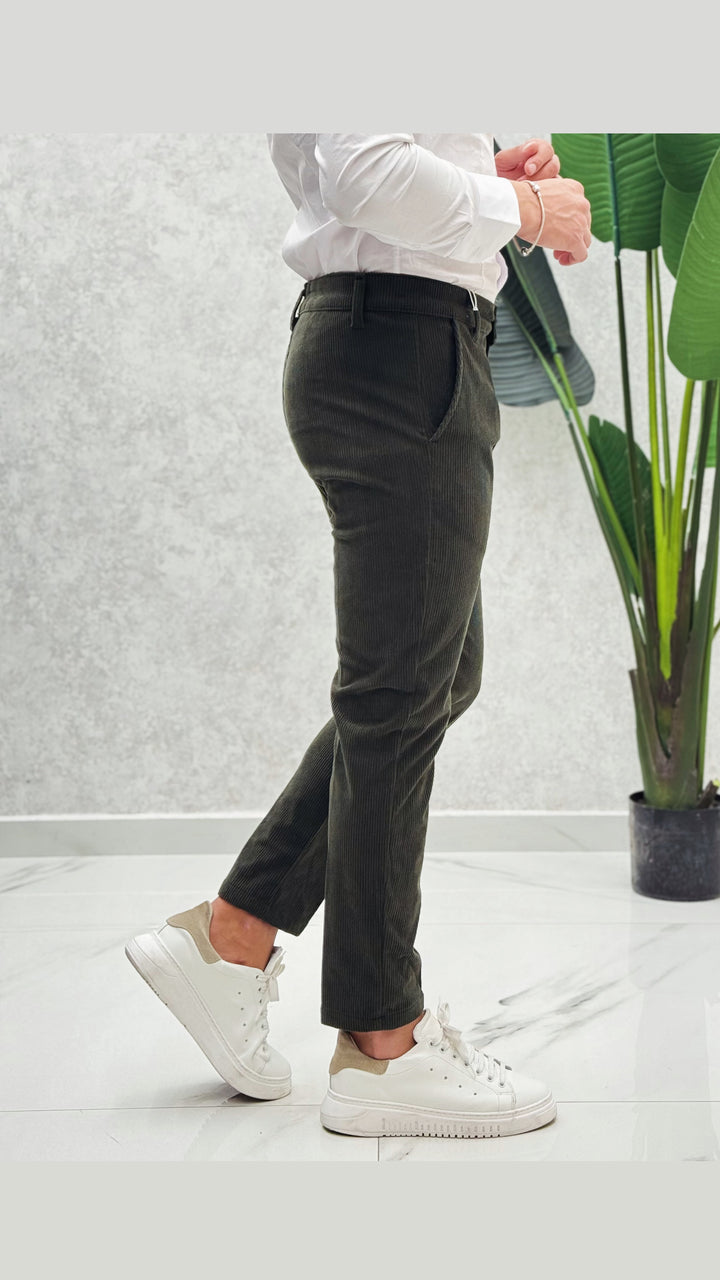 Pantalone in costine velluto, bottone centrale e privo di tasca sul retro. Vestibilità slim, il modello 1;76 per 73kg indossa M