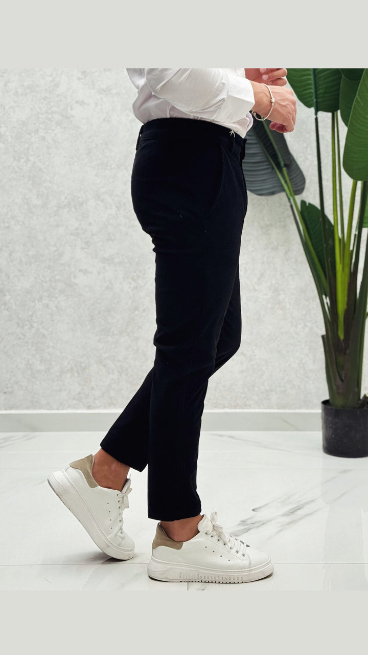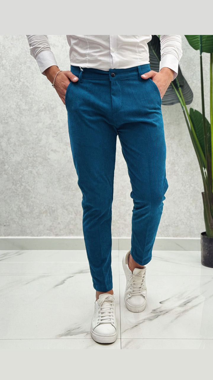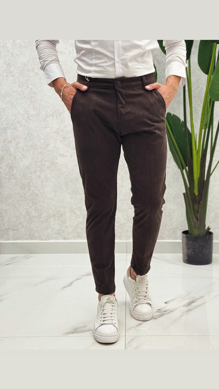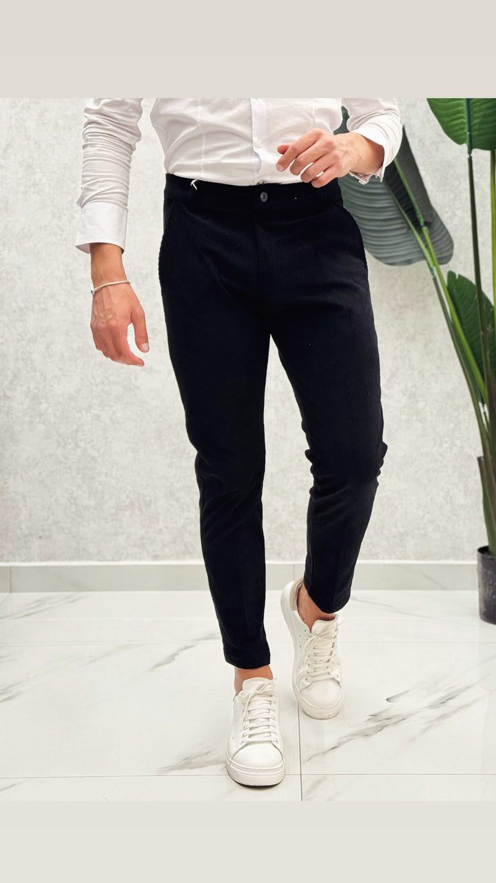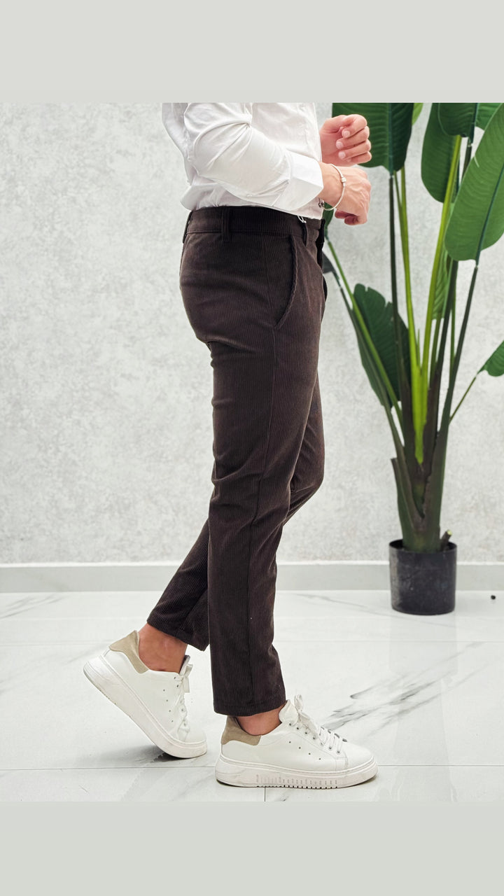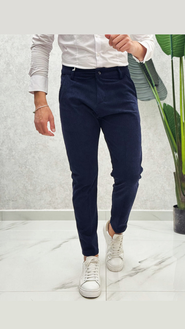 Pantalone in costine velluto, bottone centrale e privo di tasca sul retro. Vestibilità slim, il modello 1;76 per 73kg indossa M