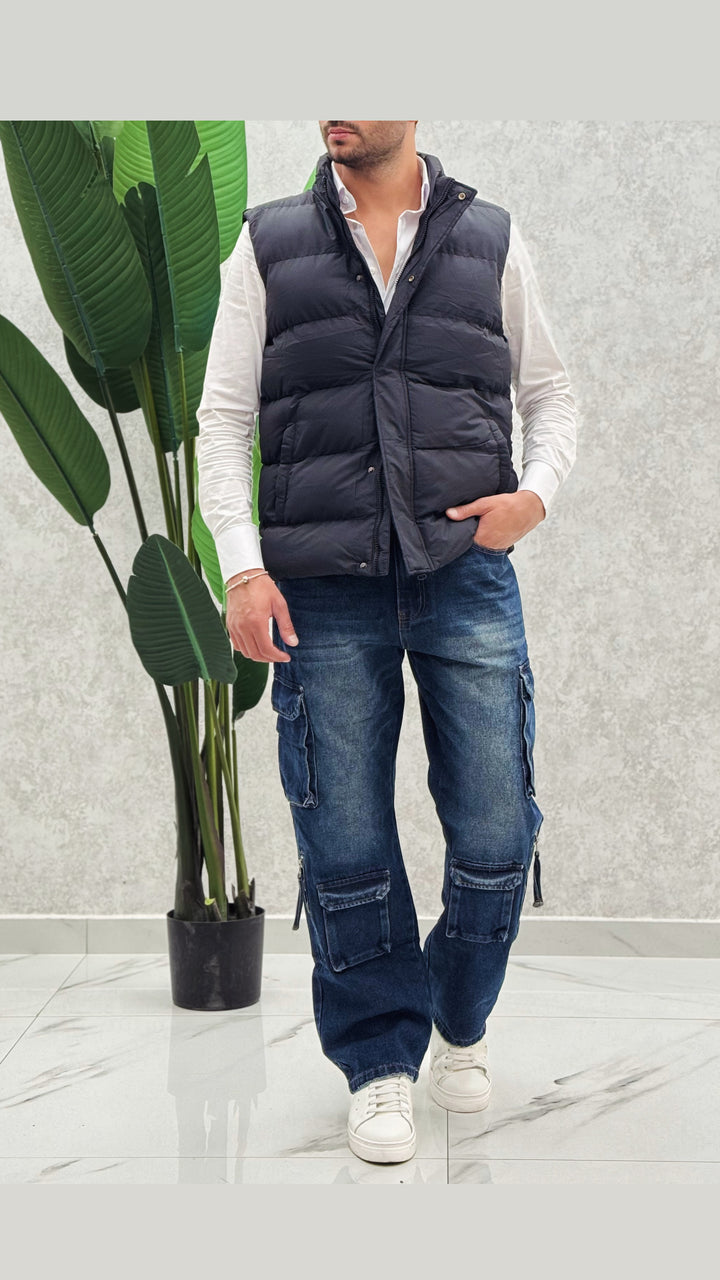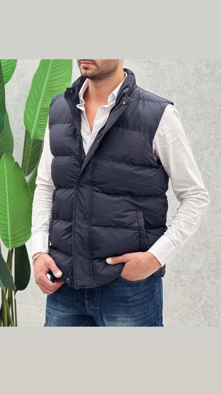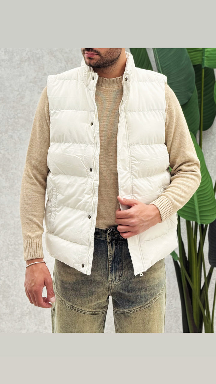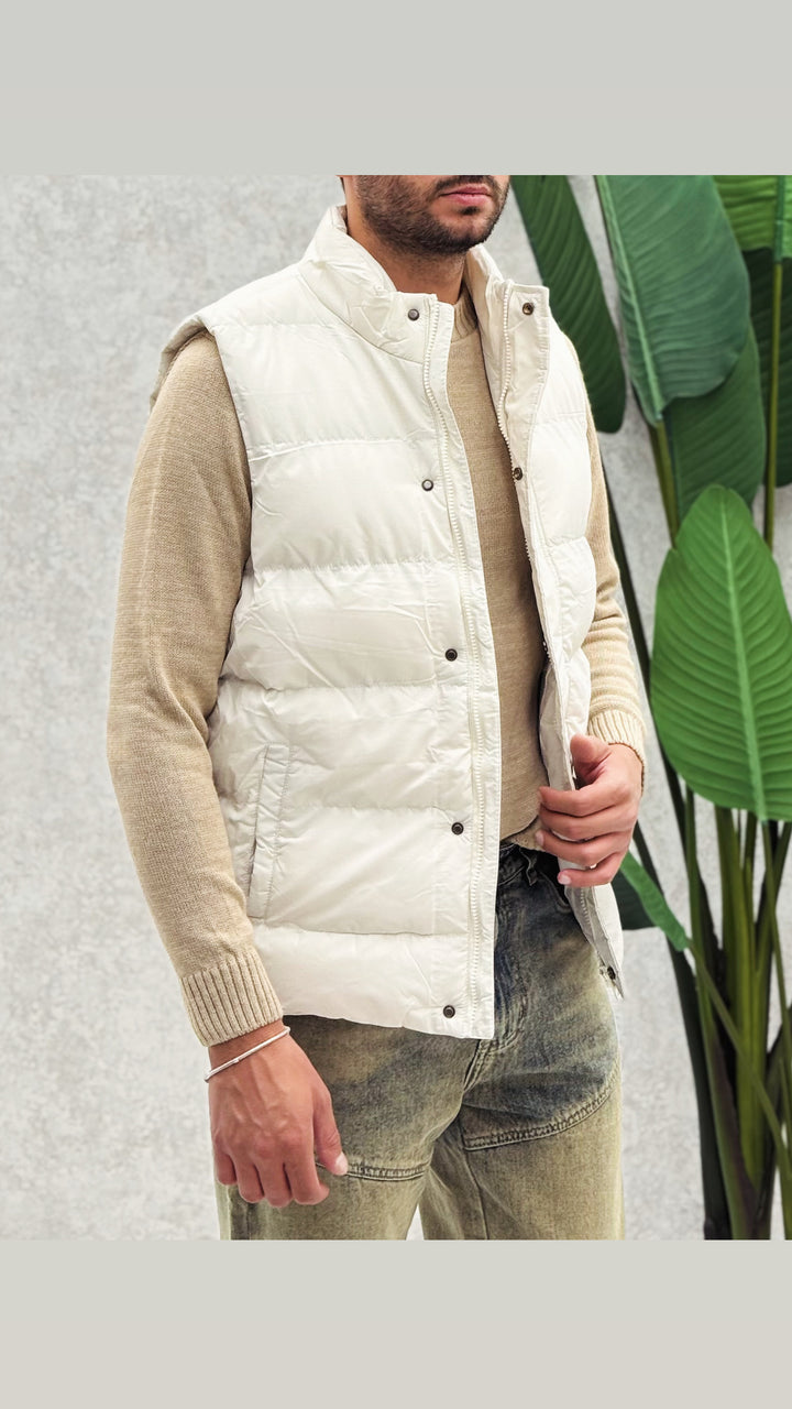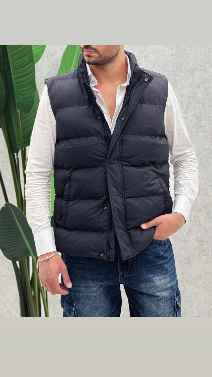 Smanicato imbottito con chiusura a zip e ciappe a scomparsa, vestibilità slim . Il modello 1,76 per 73kg indossa M