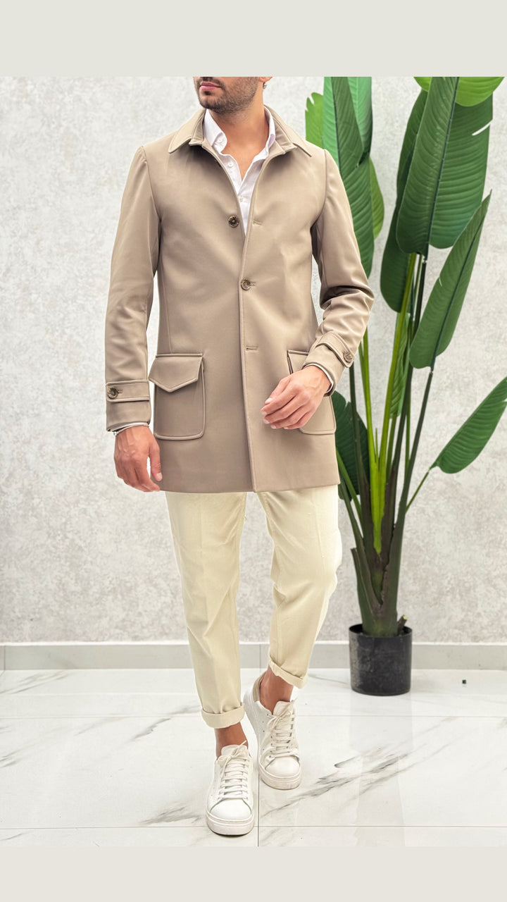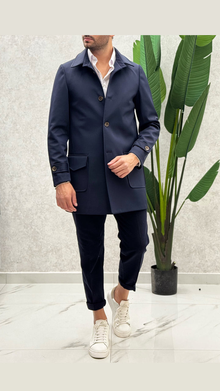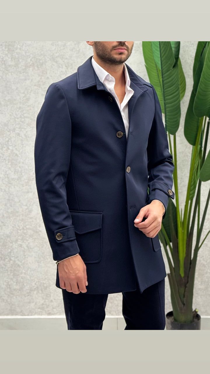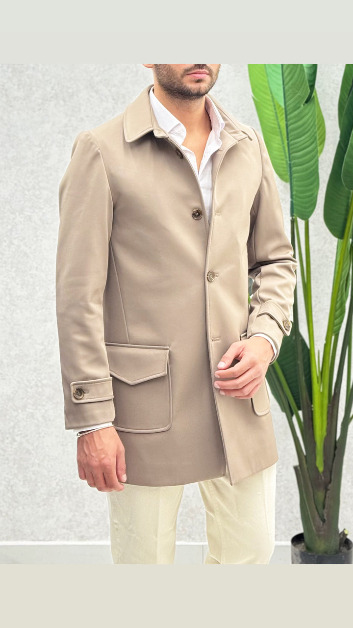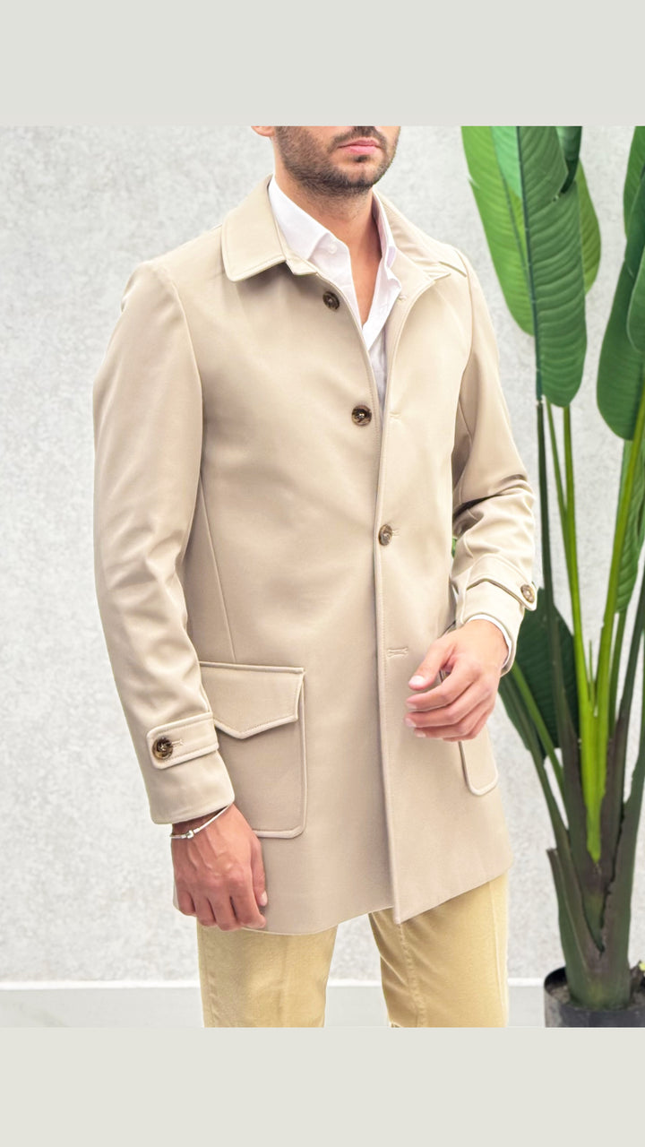 Trench in tessuto impermeabile, disponibile in diverse colorazioni. Vestibilità regular slim, il modello 1,76 per 73kg indossa 46