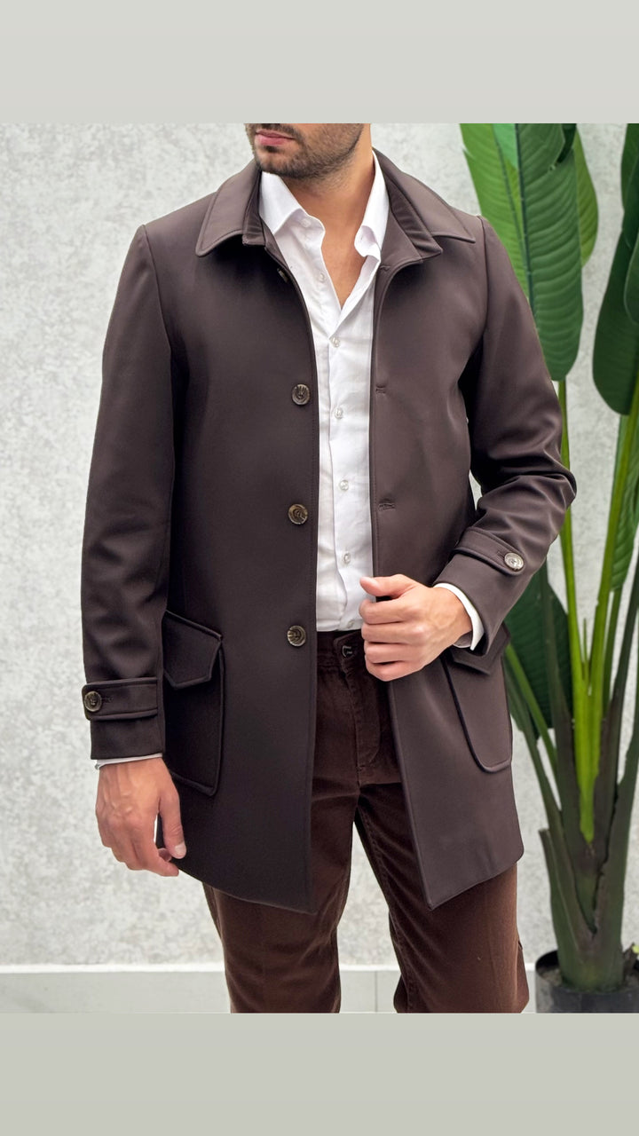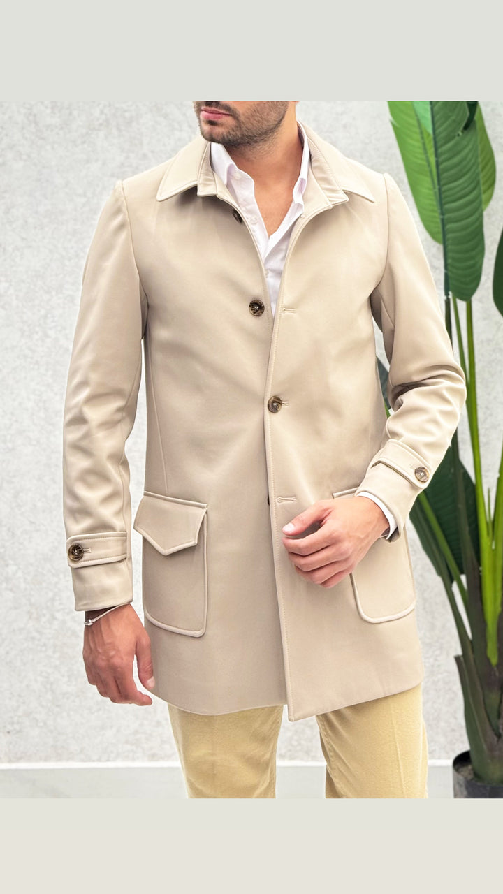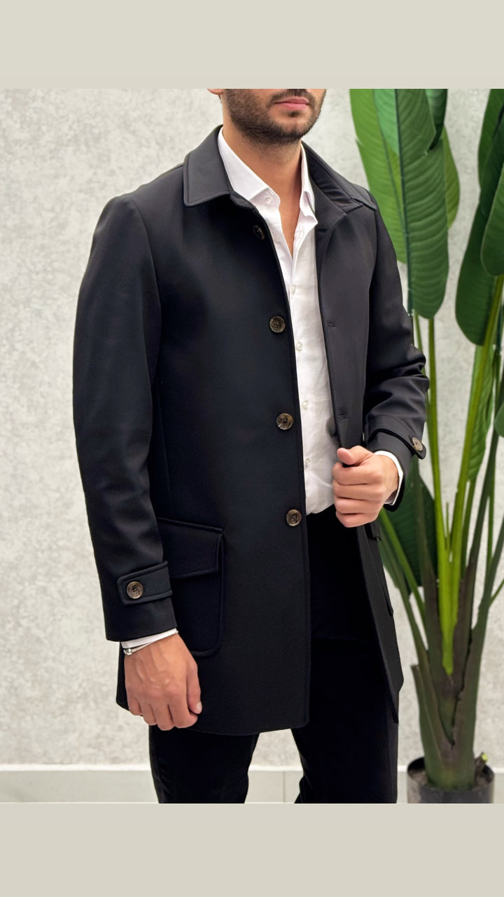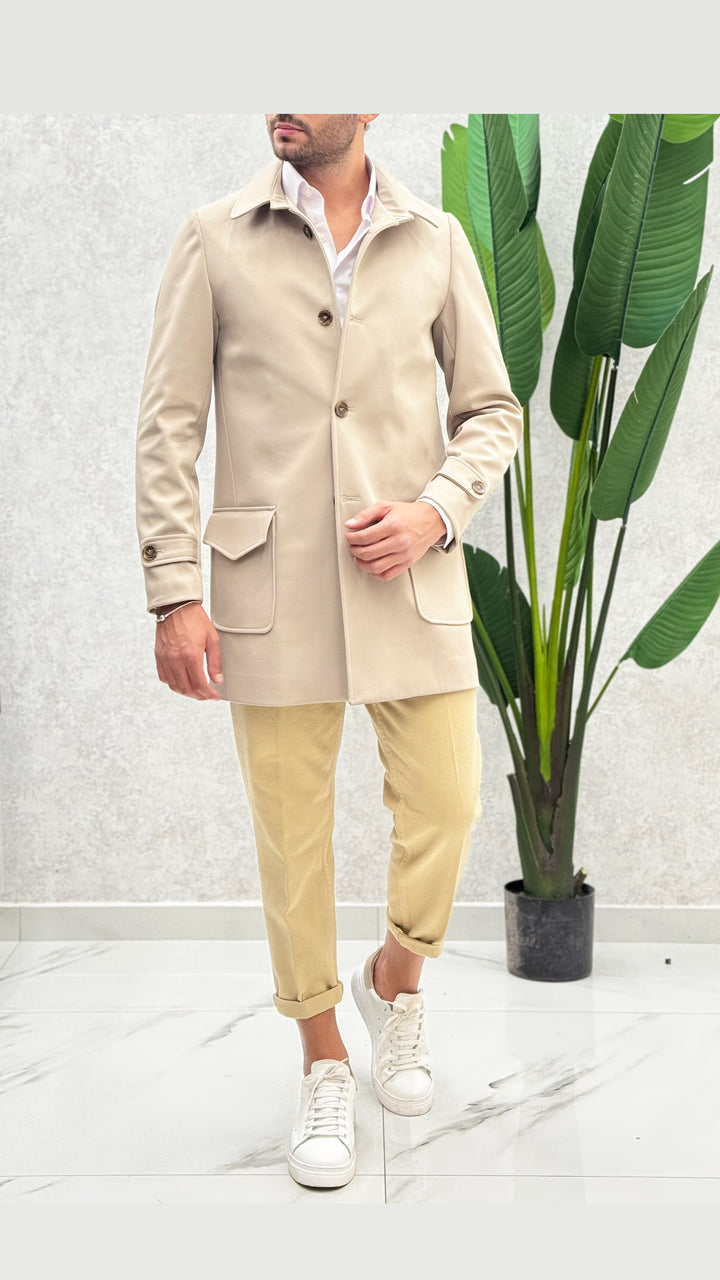 Trench in tessuto impermeabile, disponibile in diverse colorazioni. Vestibilità regular slim, il modello 1,76 per 73kg indossa 46